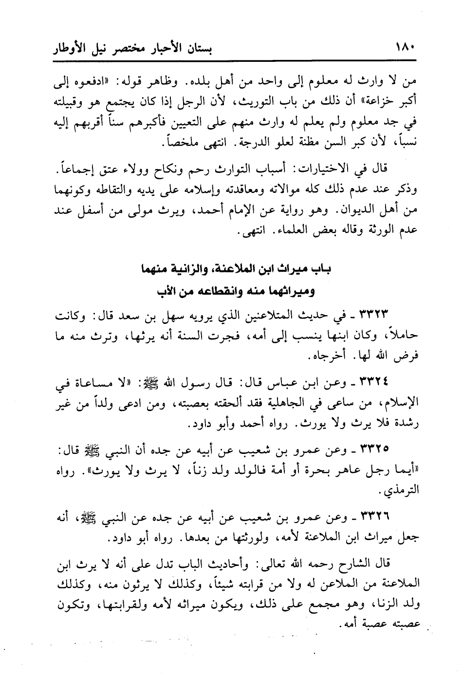 قَالَ الشَّارِحُ رَحِمَهُ اللهُ تَعَالَى: وأحاديث الْبَابِ تَدُلُّ عَلَى أَنَّهُ لا يَرِثُ ابْنُ الْمُلاعَنَةِ مِنْ الْمُلاعِنِ لَهُ وَلا مِنْ قَرَابَتِهِ شَيْئًا، وَكَذَلِكَ لا يَرِثُونَ مِنْهُ، وَكَذَلِكَ وَلَدُ الزِّنَا وَهُوَ مُجْمَعٌ عَلَى ذَلِكَ، وَيَكُونُ مِيرَاثُهُ لأُمِّهِ وَلِقَرَابَتِهَا وَتَكُونُ عَصَبَتُهُ عَصَبَةَ أُمِّهِ.