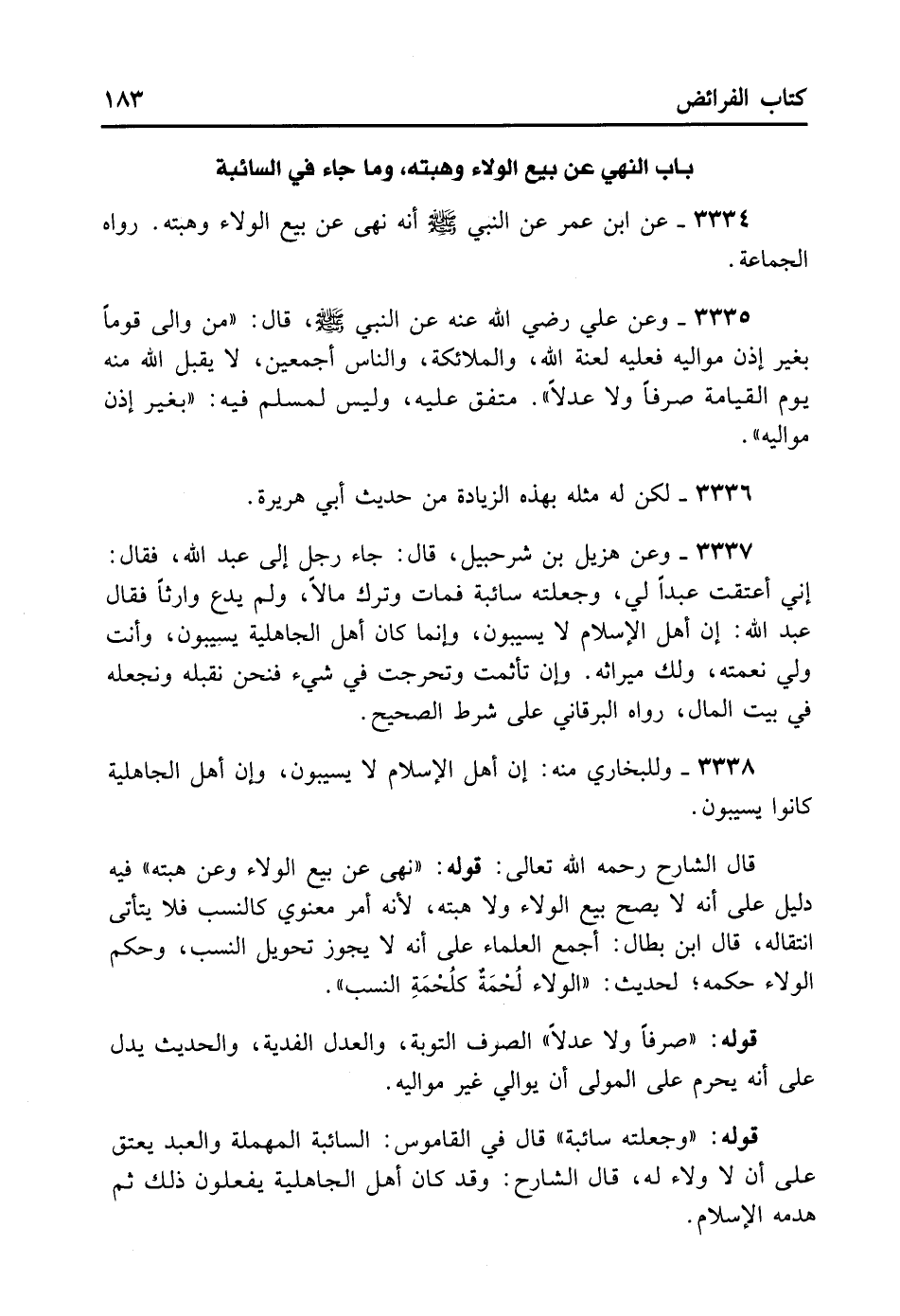 3337- وَعَنْ هُزَيْلِ بْنِ شُرَحْبِيلَ قَالَ: جَاءَ رَجُلٌ إلَى عَبْدِ اللَّهِ فَقَالَ: إنِّي أَعْتَقْتُ عَبْدًا لِي وَجَعَلْتُهُ سَائِبَةً فَمَاتَ وَتَرَكَ مَالًا وَلَمْ يَدَعْ وَارِثًا، فَقَالَ عَبْدُ اللَّهِ: إنَّ أَهْلَ الإِسْلامِ لا يُسَيِّبُونَ، وَإِنَّمَا كَانَ أَهْلُ الْجَاهِلِيَّةِ يُسَيِّبُونَ وَأَنْتَ وَلِيُّ نِعْمَتِهِ وَلَك مِيرَاثُهُ. وَإِنْ تَأَثَّمَتْ وَتَحَرَّجَتْ فِي شَيْءٍ فَنَحْنُ نَقْبَلُهُ وَنَجْعَلُهُ فِي بَيْتِ الْمَالِ. رَوَاهُ الْبَرْقَانِيُّ عَلَى شَرْطِ الصَّحِيحِ.