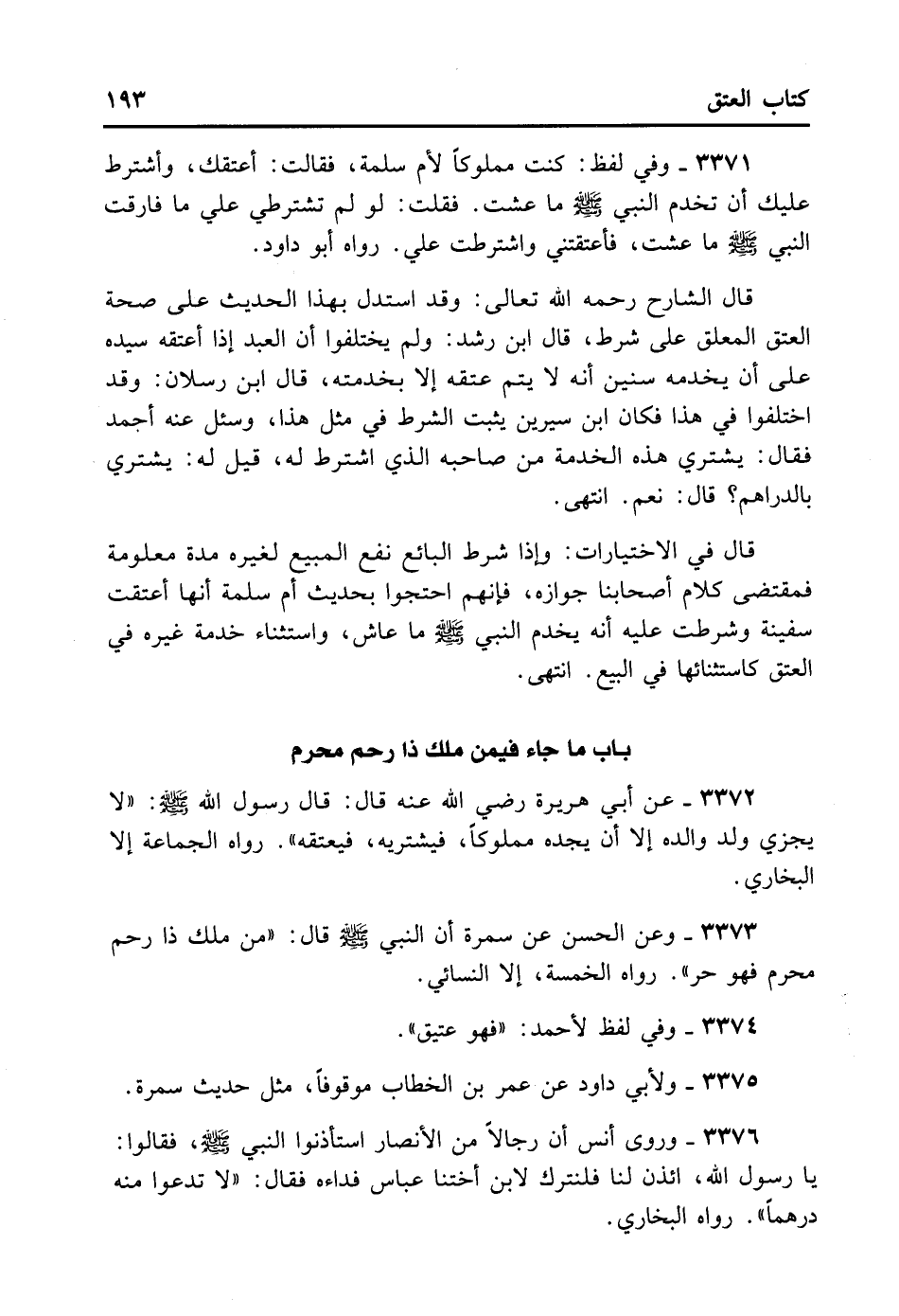 3373- وَعَنْ الْحَسَنِ عَنْ سَمُرَةَ أَنَّ النَّبِيَّ - صلى الله عليه وسلم - قَالَ: «مَنْ مَلَكَ ذَا رَحِمٍ مَحْرَمٍ فَهُوَ حُرٌّ» . رَوَاهُ الْخَمْسَةُ إلا النَّسَائِيّ.