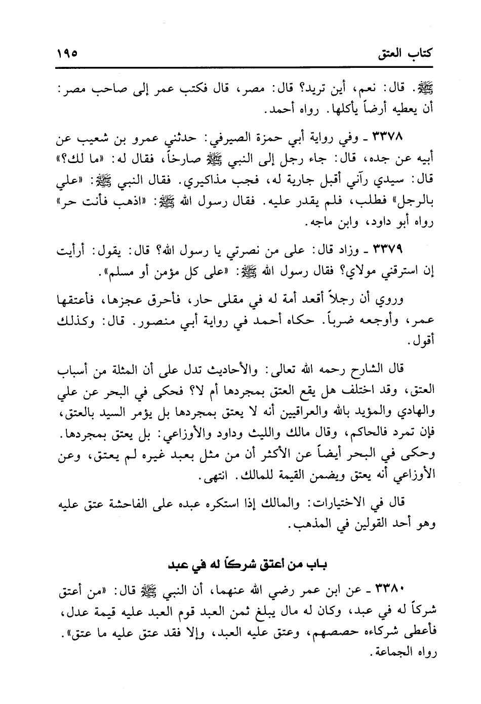 3380- عَنْ ابْنِ عُمَرَ رَضِيَ اللهُ عَنْهُمَا أَنَّ النَّبِيَّ - صلى الله عليه وسلم - قَالَ: «مَنْ أَعْتَقَ شِرْكًا لَهُ فِي عَبْدٍ وَكَانَ لَهُ مَالٌ يَبْلُغُ ثَمَنَ الْعَبْدِ قُوِّمَ الْعَبْدُ عَلَيْهِ قِيمَةَ عَدْلٍ، فَأَعْطَى شُرَكَاءَهُ حِصَصَهُمْ وَعَتَقَ عَلَيْهِ الْعَبْدُ وَإِلا فَقَدْ عَتَقَ عَلَيْهِ مَا عَتَقَ» . رَوَاهُ الْجَمَاعَةُ.