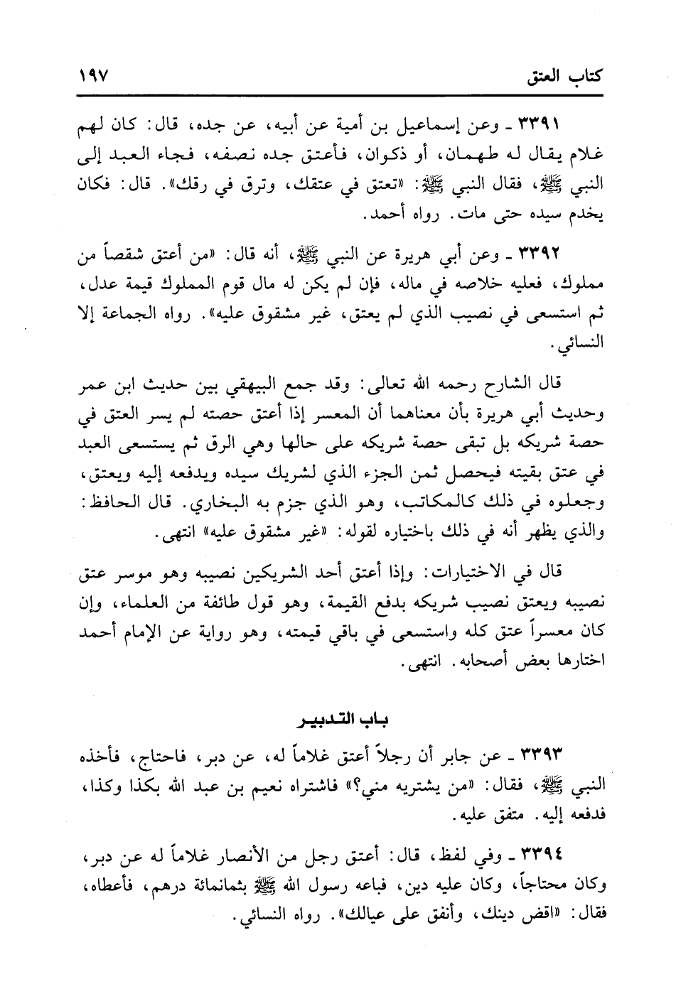 3393- عَنْ جَابِرٍ: أَنَّ رَجُلًا أَعْتَقَ غُلامًا لَهُ عَنْ دُبُرٍ، فَاحْتَاجَ فَأَخَذَهُ النَّبِيُّ - صلى الله عليه وسلم - فَقَالَ: «مَنْ يَشْتَرِيهِ مِنِّي» ؟ فَاشْتَرَاهُ نُعَيْمُ بْنُ عَبْدِ اللَّهِ بِكَذَا وَكَذَا فَدَفَعَهُ إلَيْهِ. مُتَّفَقٌ عَلَيْهِ.