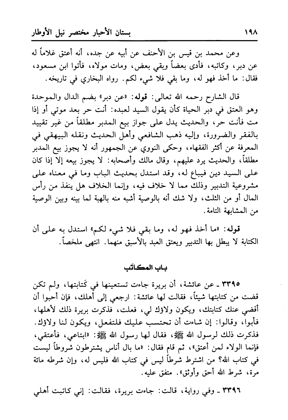 أَقْضِيَ عَنْكِ كِتَابَتَكِ وَيَكُونُ وَلاؤُكِ لِي فَعَلْتُ، فَذَكَرَتْ بَرِيرَةُ ذَلِكَ لأَهْلِهَا فَأَبَوْا وَقَالُوا: إنْ شَاءَتْ أَنْ تَحْتَسِبَ عَلَيْكِ فَلْتَفْعَلْ وَيَكُونُ لَنَا وَلاؤُكِ، فَذَكَرْتُ ذَلِكَ لِرَسُولِ اللَّهِ - صلى الله عليه وسلم -، فَقَالَ لَهَا رَسُولُ اللَّهِ - صلى الله عليه وسلم -: «ابْتَاعِي فَأَعْتِقِي، فَإِنَّمَا الْوَلاءُ لِمَنْ أَعْتَقَ» . ثُمَّ قَامَ فَقَالَ: «مَا بَالُ أُنَاسٍ يَشْتَرِطُونَ شُرُوطًا لَيْسَتْ فِي كِتَابِ اللَّهِ؟ مَنْ اشْتَرَطَ شَرْطًا لَيْسَ فِي كِتَابِ اللَّهِ فَلَيْسَ لَهُ، وَإِنْ شَرَطَهُ مِائَةَ مَرَّةٍ، شَرْطُ اللَّهِ أَحَقُّ وَأَوْثَقُ» . مُتَّفَقٌ عَلَيْهِ.