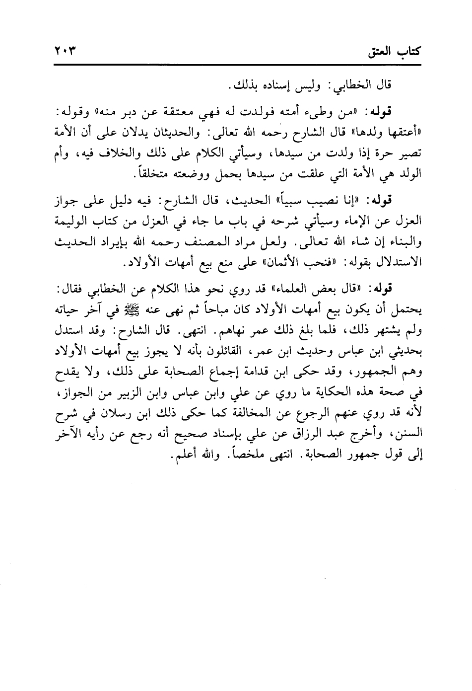 قَوْلُهُ: (إنَّا نُصِيبُ سَبْيًا) الْحَدِيث قَالَ الشَّارِحُ: فِيهِ دَلِيلٌ عَلَى جَوَازِ الْعَزْلِ عَنْ الإِمَاءِ وَسيَأْتِي شَرْحُهُ فِي بَابِ مَا جَاءَ فِي الْعَزْلِ مِنْ كِتَابِ الْوَلِيمَةِ وَالْبِنَاءِ إنْ شَاءَ اللَّهُ تَعَالَى. وَلَعَلَّ مُرَادَ الْمُصَنِّفِ رَحِمَهُ اللَّهُ بِإِيرَادِ الْحَدِيثِ الاسْتِدْلال بِقَوْلِهِ: (فَنُحِبُّ الأَثْمَانَ) عَلَى مَنْعِ بَيْعِ أُمَّهَاتِ الأَوْلادِ.