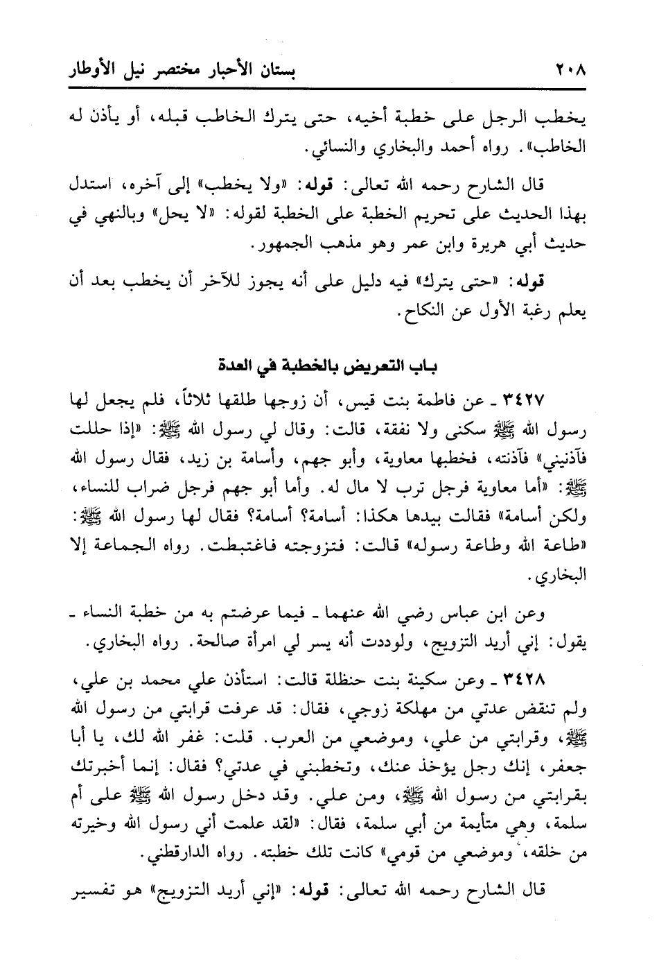 3428- وَعَنْ سُكَيْنَةَ بِنْتِ حَنْظَلَةَ قَالَتْ: اسْتَأْذَنَ عَلَيَّ مُحَمَّدُ بْنُ عَلِيٍّ وَلَمْ تَنْقَضِ عِدَّتِي مِنْ مَهْلَكَةِ زَوْجِي، فَقَالَ: قَدْ عَرَفْتِ قَرَابَتِي مِنْ رَسُولِ اللَّهِ - صلى الله عليه وسلم - وَقَرَابَتِي مِنْ عَلِيٍّ، وَمَوْضِعِي مِنْ الْعَرَبِ، قُلْت: غَفَرَ اللَّهُ لَك يَا أَبَا جَعْفَرٍ إنَّكَ رَجُلٌ يُؤْخَذُ عَنْكَ وَتَخْطُبُنِي فِي عِدَّتِي؟ فَقَالَ: إنَّمَا أَخْبَرْتُكِ بِقَرَابَتِي مِنْ رَسُولِ اللَّهِ - صلى الله عليه وسلم - وَمِنْ عَلِيٍّ وَقَدْ دَخَلَ رَسُولُ اللَّهِ - صلى الله عليه وسلم - عَلَى أُمِّ سَلَمَةَ وَهِيَ مُتَأَيِّمَةٌ مِنْ أَبِي سَلَمَةَ، فَقَالَ: «لَقَدْ عَلِمْتِ أَنِّي رَسُولُ اللَّهِ - صلى الله عليه وسلم - وَخِيرَتُهُ مِنْ خَلْقِهِ وَمَوْضِعِي مِنْ قَوْمِي» . كَانَتْ تِلْكَ خِطْبَتَهُ. رَوَاهُ الدَّارَقُطْنِيّ.
