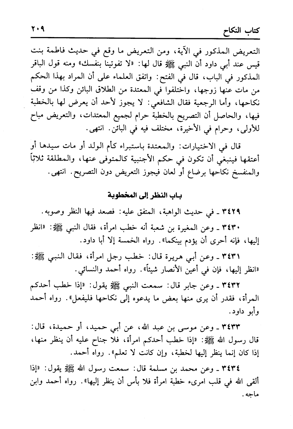 3430- وَعَنْ الْمُغِيرَةِ بْنِ شُعْبَةَ: أَنَّهُ خَطَبَ امْرَأَةً، فَقَالَ النَّبِيُّ - صلى الله عليه وسلم -: ... «اُنْظُرْ إلَيْهَا فَإِنَّهُ أَحْرَى أَنْ يُؤْدَمَ بَيْنَكُمَا» . رَوَاهُ الْخَمْسَةُ إلا أَبَا دَاوُد.