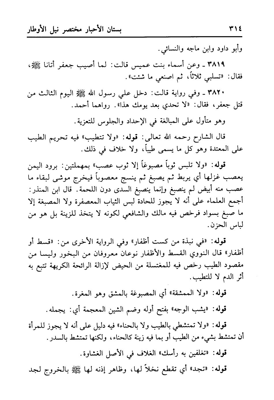 3820- وَفِي رِوَايَةٍ قَالَتْ: دَخَلَ عَلَيَّ رَسُولُ اللَّهِ - صلى الله عليه وسلم - الْيَوْمَ الثَّالِثَ مِنْ قَتْلِ جَعْفَرٍ، فَقَالَ: «لا تُحِدِّي بَعْدَ يَوْمِك هَذَا» . رَوَاهُمَا أَحْمَدُ.