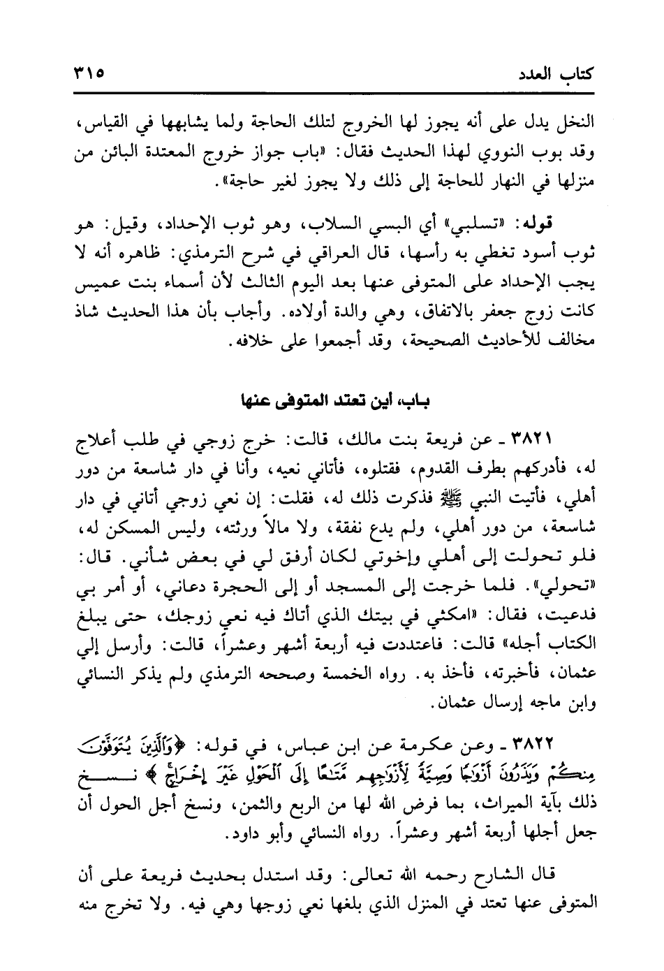 3821- عَنْ فُرَيْعَةَ بِنْتِ مَالِكٍ قَالَتْ: خَرَجَ زَوْجِي فِي طَلَبِ أَعْلاجٍ لَهُ فَأَدْرَكَهُمْ فِي طَرَفِ الْقُدُومِ فَقَتَلُوهُ، فَأَتَانِي نَعْيُهُ وَأَنَا فِي دَارٍ شَاسِعَةٍ مِنْ دُورِ أَهْلِي، فَأَتَيْتُ النَّبِيَّ - صلى الله عليه وسلم - فَذَكَرْت ذَلِكَ لَهُ، فَقُلْت: إنَّ نَعْيَ زَوْجِي أَتَانِي فِي دَارٍ شَاسِعَةٍ مِنْ دُورِ أَهْلِي، وَلَمْ يَدَعْ نَفَقَةً وَلا مَالاً وَرِثْتُهُ، وَلَيْسَ الْمَسْكَنُ لَهُ، فَلَوْ تَحَوَّلْت إلَى أَهْلِي وَإِخْوَتِي لَكَانَ أَرْفَقَ لِي فِي بَعْضِ شَأْنِي، قَالَ: «تَحَوَّلِي» . فَلَمَّا خَرَجْت إلَى الْمَسْجِدِ أَوْ إلَى الْحُجْرَةِ دَعَانِي أَوْ أَمَرَ بِي فَدُعِيتُ، فَقَالَ: «اُمْكُثِي فِي بَيْتِكِ الَّذِي أَتَاكِ فِيهِ نَعْيُ زَوْجِكِ حَتَّى يَبْلُغَ الْكِتَابُ أَجَلَهُ» . قَالَتْ: فَاعْتَدَدْت فِيهِ أَرْبَعَةَ أَشْهُرٍ وَعَشْرًا. قَالَتْ: وَأَرْسَلَ إلَيَّ عُثْمَانُ فَأَخْبَرْتُهُ، فَأَخَذَ بِهِ. رَوَاهُ الْخَمْسَةُ وَصَحَّحَهُ التِّرْمِذِيُّ، وَلَمْ يَذْكُرْ النَّسَائِيّ وَابْنُ مَاجَةْ إرْسَالَ عُثْمَانَ.