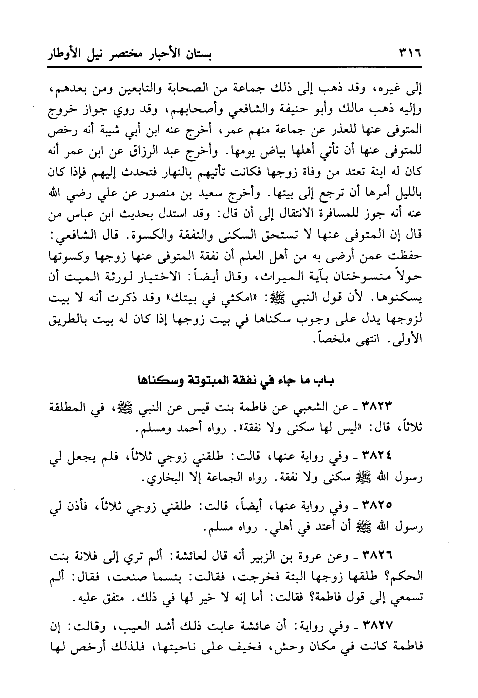 إلَى غَيْرِهِ، وَقَدْ ذَهَبَ إلَى ذَلِكَ جَمَاعَةٌ مِنْ الصَّحَابَةِ وَالتَّابِعِينَ وَمَنْ بَعْدَهُمْ، وَإِلَيْهِ ذَهَبَ مَالِكٌ وَأَبُو حَنِيفَةَ وَالشَّافِعِيُّ وَأَصْحَابُهُمْ. وَقَدْ رُوِيَ جَوَازُ خُرُوجِ الْمُتَوَفَّى عَنْهَا لِلْعُذْرِ عَنْ جَمَاعَةٍ، مِنْهُمْ عُمَرُ، أَخْرَجَ عَنْهُ ابْنُ أَبِي شَيْبَةَ أَنَّهُ رَخَّصَ لِلْمُتَوَفَّى عَنْهَا أَنْ تَأْتِيَ أَهْلَهَا بَيَاضَ يَوْمِهَا. وَأَخْرَجَ عَبْدُ الرَّزَّاقِ عَنْ ابْنِ عُمَرَ أَنَّهُ كَانَ لَهُ ابْنَةٌ تَعْتَدُّ مِنْ وَفَاةِ زَوْجِهَا فَكَانَتْ تَأْتِيهِمْ بِالنَّهَارِ فَتُحَدِّثُ ... إلَيْهِمْ، فَإِذَا كَانَ بِاللَّيْلِ أَمَرَهَا أَنْ تَرْجِعَ إلَى بَيْتِهَا. وَأَخْرَجَ سَعِيدُ بْنُ مَنْصُورٍ عَنْ عَلِيٍّ - رضي الله عنه - أَنَّهُ جَوَّزَ لِلْمُسَافِرَةِ الِانْتِقَالَ. إلى أن قَالَ: وَقَدْ اسْتَدَلَّ بِحَدِيثِ ابْنِ عَبَّاسٍ مَنْ قَالَ: إنَّ الْمُتَوَفَّى عَنْهَا لا تَسْتَحِقُّ السُّكْنَى وَالنَّفَقَةَ وَالْكِسْوَةَ. قَالَ الشَّافِعِيُّ: حَفِظْت عَمَّنْ أَرْضَى بِهِ مِنْ أَهْلِ الْعِلْمِ أَنَّ نَفَقَةَ الْمُتَوَفَّى عَنْهَا زَوْجُهَا وَكِسْوَتَهَا حَوْلًا مَنْسُوخَتَانِ بِآيَةِ الْمِيرَاثِ. وَقَالَ أَيْضًا: الاخْتِيَارُ لِوَرَثَةِ الْمَيِّتِ أَنْ يُسَكِّنُوهَا لأَنَّ قَوْلَ النَّبِيِّ - صلى الله عليه وسلم -: «اُمْكُثِي فِي بَيْتِكِ» وَقَدْ ذَكَرَتْ أَنَّهُ لا بَيْتَ لِزَوْجِهَا، يَدُلُّ عَلَى وُجُوبِ سُكْنَاهَا فِي بَيْتِ زَوْجِهَا إذَا كَانَ لَهُ بَيْتٌ بِالطَّرِيقِ الأَوْلَى. انْتَهَى مُلَخَّصًا.