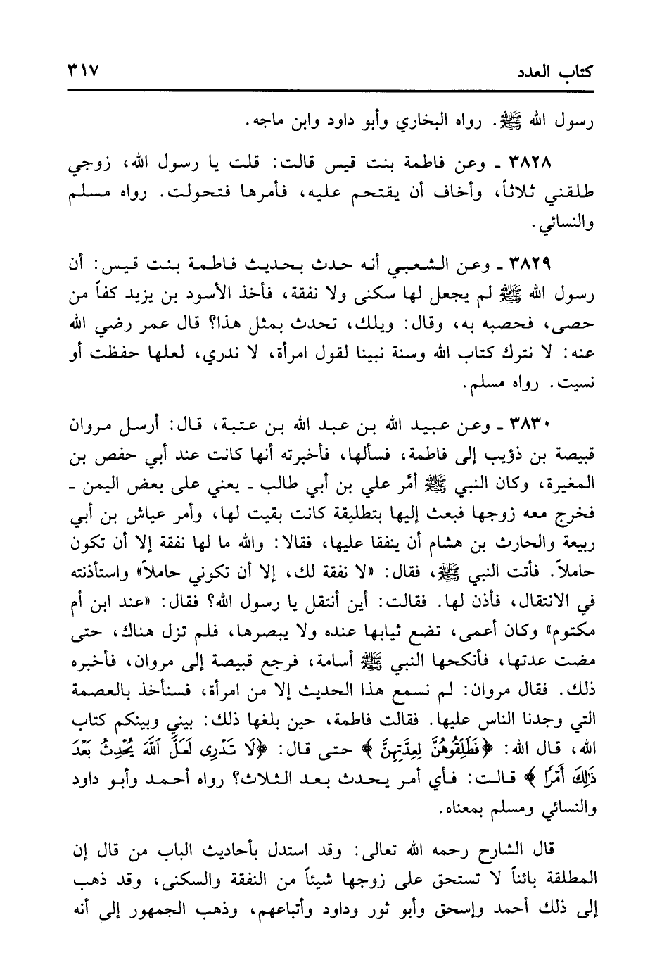 3829- وَعَنْ الشَّعْبِيِّ أَنَّهُ حَدَّثَ بِحَدِيثِ فَاطِمَةَ بِنْتِ قَيْسٍ أَنَّ ... رَسُولَ اللَّهِ - صلى الله عليه وسلم - لَمْ يَجْعَلْ لَهَا سُكْنَى وَلا نَفَقَةً، فَأَخَذَ الأَسْوَدُ بْنُ يَزِيدَ كَفًّا مِنْ حَصًى فَحَصَبَهُ بِهِ وَقَالَ: وَيْلَكَ تُحَدِّثُ بِمِثْلِ هَذَا؟ قَالَ عُمَرُ: لا نَتْرُكُ كِتَابَ اللَّهِ وَسُنَّةَ نَبِيِّنَا - صلى الله عليه وسلم - لِقَوْلِ امْرَأَةٍ لا نَدْرِي لَعَلَّهَا حَفِظَتْ أَوْ نَسِيَتْ. رَوَاهُ مُسْلِمٌ.