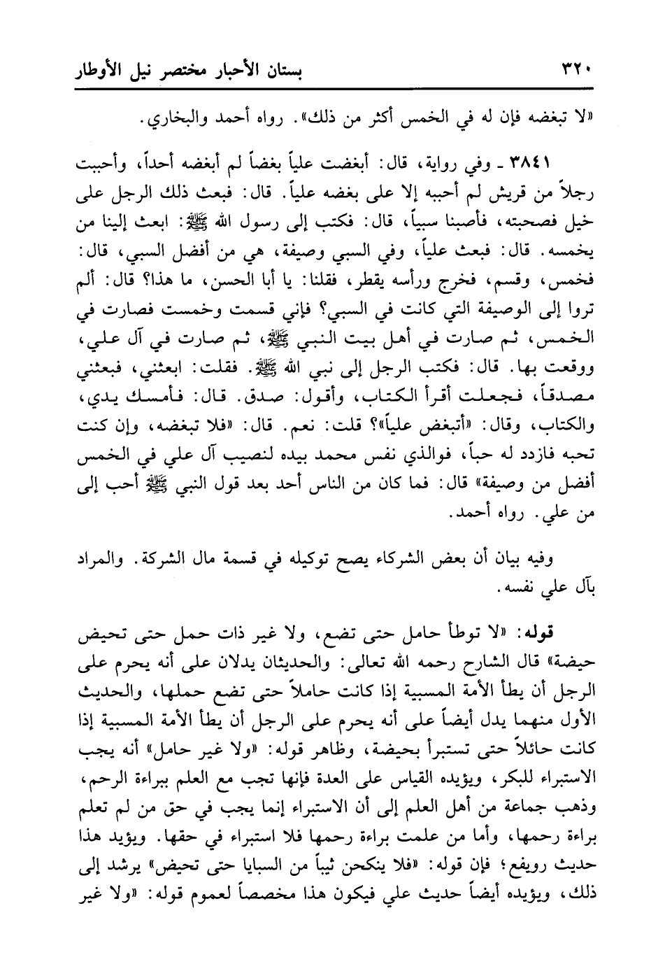 3841- وَفِي رِوَايَةٍ قَالَ: أَبْغَضْت عَلِيًّا بُغْضًا لَمْ أُبْغِضْهُ أَحَدًا، وَأَحْبَبْت رَجُلًا مِنْ قُرَيْشٍ لَمْ أُحْبِبْهُ إلا عَلَى بُغْضِهِ عَلِيًّا، قَالَ: فَبُعِثَ ذَلِكَ الرَّجُلُ عَلَى خَيْلٍ فَصَحِبْتُهُ فَأَصَبْنَا سَبَايَا، قَالَ: فَكَتَبَ إلَى رَسُولِ اللَّهِ - صلى الله عليه وسلم -: ابْعَثْ إلَيْنَا مَنْ يُخَمِّسُهُ، قَالَ: فَبَعَثَ إلَيْنَا عَلِيًّا، وَفِي السَّبْيِ وَصِيفَةٌ. هِيَ مِنْ أَفْضَلِ السَّبْيِ، قَالَ فَخَمَّسَ وَقَسَمَ، فَخَرَجَ وَرَأْسُهُ يَقْطُرُ، فَقُلْنَا: يَا أَبَا الْحَسَنِ مَا هَذَا؟ قَالَ: أَلَمْ تَرَوْا إلَى الْوَصِيفَةِ الَّتِي كَانَتْ فِي السَّبْيِ؟ فَإِنِّي قَسَمْت وَخَمَّسْت فَصَارَتْ فِي الْخُمُسِ ثُمَّ صَارَتْ فِي أَهْلِ بَيْتِ النَّبِيِّ - صلى الله عليه وسلم - ثُمَّ صَارَتْ فِي آلِ عَلِيٍّ وَوَقَعْت بِهَا، قَالَ: فَكَتَبَ الرَّجُلُ إلَى نَبِيِّ اللَّهِ - صلى الله عليه وسلم -، فَقُلْت: ابْعَثْنِي، فَبَعَثَنِي مُصَدِّقًا، فَجَعَلْت أَقْرَأُ الْكِتَابَ وَأَقُولُ: صَدَقَ، قَالَ: فَأَمْسَكَ يَدَيَّ وَالْكِتَابَ وَقَالَ: «أَتُبْغِضُ عَلِيًّا» ؟ قُلْت: نَعَمْ، قَالَ: «فَلا تُبْغِضْهُ، وَإِنْ كُنْت تُحِبُّهُ فَازْدَدْ لَهُ حُبًّا، فَوَاَلَّذِي نَفْسُ مُحَمَّدٍ بِيَدِهِ لَنَصِيبُ آلِ عَلِيٍّ فِي الْخُمْسِ أَفْضَلُ مِنْ وَصِيفَةٍ» . قَالَ: فَمَا كَانَ مِنْ النَّاسِ أَحَدٌ بَعْدَ قَوْلِ النَّبِيِّ - صلى الله عليه وسلم - أَحَبَّ إلَيَّ مِنْ عَلِيٍّ. رَوَاهُ أَحْمَدُ.
