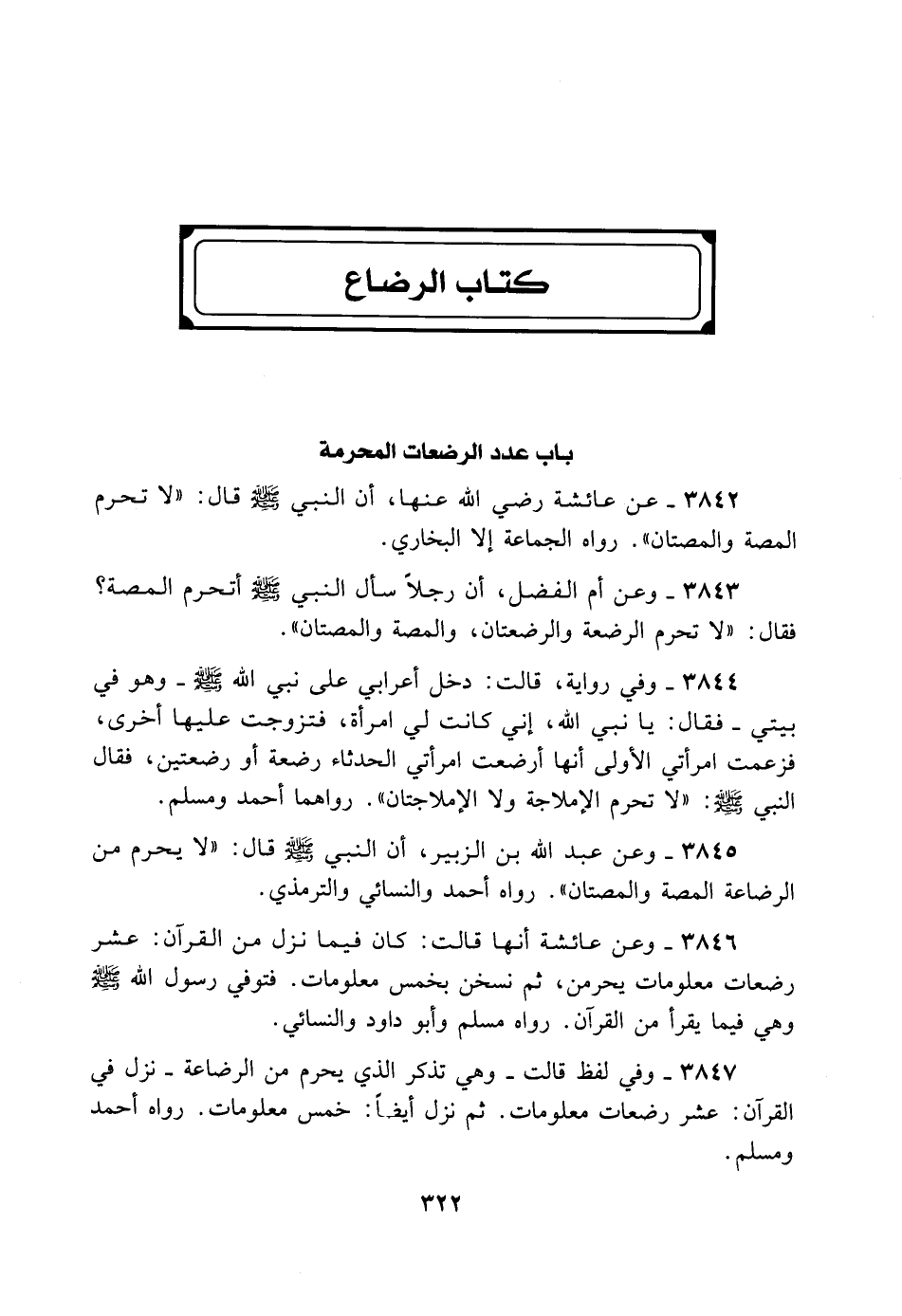 3842- عَنْ عَائِشَةَ رَضِيَ اللهُ عَنْهَا أَنَّ النَّبِيِّ - صلى الله عليه وسلم - قَالَ: «لا تُحَرِّمُ الْمَصَّةُ وَلا الْمَصَّتَانِ» . رَوَاهُ الْجَمَاعَةُ إلا الْبُخَارِيَّ.