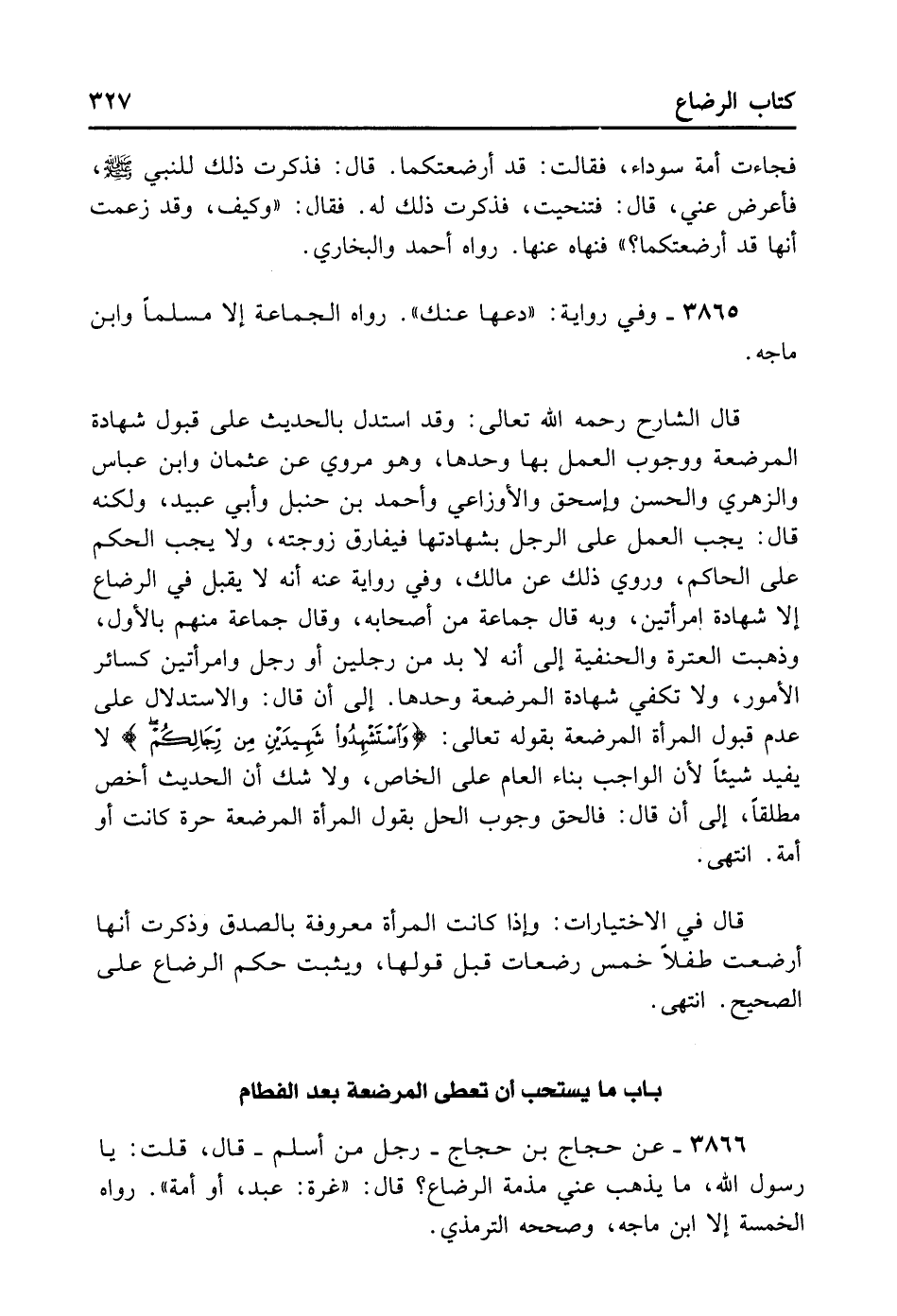 فَجَاءَتْ أَمَةٌ سَوْدَاءُ فَقَالَتْ: قَدْ أَرْضَعْتُكُمَا. قَالَ: فَذَكَرْت ذَلِكَ لِلنَّبِيِّ - صلى الله عليه وسلم - فَأَعْرَضَ عَنِّي، قَالَ: فَتَنَحَّيْت فَذَكَرْت ذَلِكَ لَهُ، فَقَالَ: «وَكَيْفَ وَقَدْ زَعَمَتْ أَنَّهَا قَدْ أَرْضَعَتْكُمَا» . فَنَهَاهُ عَنْهَا. رَوَاهُ أَحْمَدُ وَالْبُخَارِيُّ.