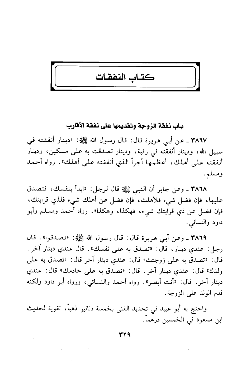 3869- وَعَنْ أَبِي هُرَيْرَةَ قَالَ: قَالَ رَسُولُ اللَّهِ - صلى الله عليه وسلم -: «تَصَدَّقُوا» . قَالَ رَجُلٌ: عِنْدِي دِينَارٌ، قَالَ: «تَصَدَّقْ بِهِ عَلَى نَفْسِك» . قَالَ: عِنْدِي دِينَارٌ آخَرُ، قَالَ: «تَصَدَّقْ بِهِ عَلَى زَوْجَتِك» . قَالَ: عِنْدِي دِينَارٌ آخَرُ، قَالَ: «تَصَدَّقْ بِهِ عَلَى وَلَدِك» . قَالَ: عِنْدِي دِينَارٌ آخَرُ، قَالَ: «تَصَدَّقْ بِهِ عَلَى خَادِمِك» . قَالَ: عِنْدِي دِينَارٌ آخَرُ، قَالَ: «أَنْتَ أَبْصَرُ بِهِ» . رَوَاهُ أَحْمَدُ وَالنَّسَائِيُّ، وَرَوَاهُ أَبُو دَاوُد لَكِنَّهُ قَدَّمَ الْوَلَدَ عَلَى الزَّوْجَةِ.