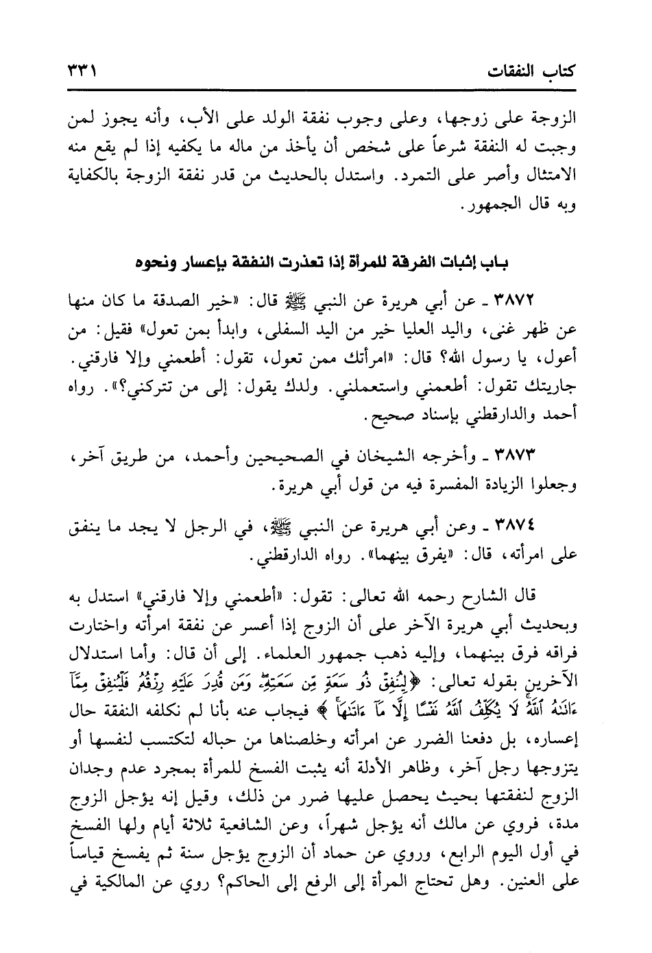 قَالَ الشَّارِحُ رَحِمَهُ اللهُ تَعَالَى: «تَقُولُ أَطْعِمْنِي وَإِلا فَارِقْنِي» اُسْتُدِلَّ بِهِ وَبِحَدِيثِ أَبِي هُرَيْرَةَ الآخَرِ عَلَى أَنَّ الزَّوْجَ إذَا أُعْسِرَ عَنْ نَفَقَةِ امْرَأَتِهِ وَاخْتَارَتْ فِرَاقَهُ فُرِّقَ بَيْنَهُمَا، وَإِلَيْهِ ذَهَبَ جُمْهُورُ الْعُلَمَاءِ. إلى أن قال: وَأَمَّا اسْتِدْلالُ الآخَرِينَ بِقَوْلِهِ تَعَالَى: {لِيُنفِقْ ذُو سَعَةٍ مِّن سَعَتِهِ وَمَن قُدِرَ عَلَيْهِ رِزْقُهُ فَلْيُنفِقْ مِمَّا آتَاهُ اللَّهُ لَا يُكَلِّفُ اللَّهُ نَفْساً إِلَّا مَا آتَاهَا} فَيُجَابُ عَنْهُ بِأَنَّا لَمْ نُكَلِّفْهُ النَّفَقَةَ حَالَ إعْسَارِهِ، بَلْ دَفَعْنَا الضَّرَرَ عَنْ امْرَأَتِهِ وَخَلَّصْنَاهَا مِنْ حِبَالِهِ لِتَكْتَسِبَ لِنَفْسِهَا