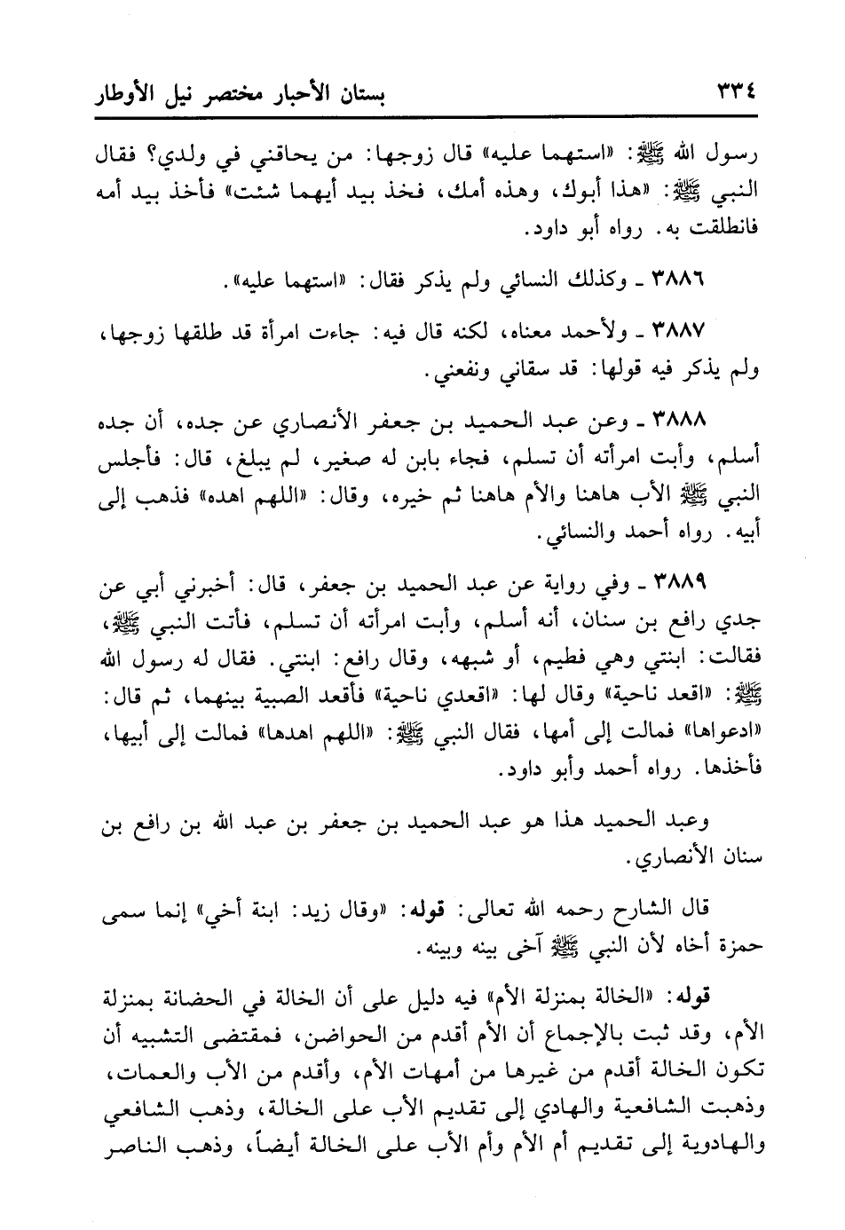 .. رَسُولُ اللَّهِ - صلى الله عليه وسلم -: «اسْتَهِمَا عَلَيْهِ» . فَقَالَ زَوْجُهَا: مَنْ يُحَاقُّنِي فِي وَلَدِي؟ فَقَالَ النَّبِيُّ - صلى الله عليه وسلم -: (هَذَا أَبُوك وَهَذِهِ أُمُّك فَخُذْ بِيَدِ أَيِّهِمَا شِئْت» . فَأَخَذَ بِيَدِ أُمِّهِ فَانْطَلَقَتْ بِهِ. رَوَاهُ أَبُو دَاوُد.