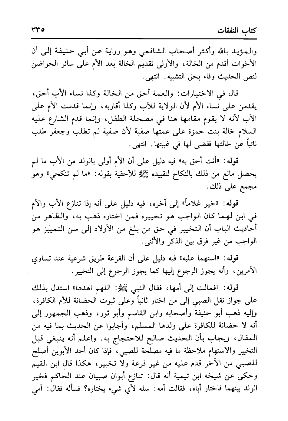 قَوْلُهُ: فَمَالَتْ إلَى أُمِّهَا فَقَالَ النَّبِيُّ - صلى الله عليه وسلم -: «اللَّهُمَّ اهْدِهَا» اُسْتُدِلَّ بِذَلِكَ عَلَى جَوَازِ نَقْلِ الصَّبِيِّ إلَى مَنْ اخْتَارَ ثَانِيًا، وَعَلَى ثُبُوتِ الْحَضَانَةِ لِلأُمِّ الْكَافِرَةِ وَإِلَيْهِ ذَهَبَ أَبُو حَنِيفَةَ وَأَصْحَابُهُ وَابْنُ الْقَاسِمِ وَأَبُو ثَوْرٍ وَذَهَبَ الْجُمْهُورُ إلَى أَنَّهُ لا حَضَانَةَ لِلْكَافِرَةِ عَلَى وَلَدِهَا الْمُسْلِمِ وَأَجَابُوا عَنْ الْحَدِيثِ بِمَا فِيهِ مِنْ الْمَقَالِ وَيُجَابُ بِأَنَّ الْحَدِيثَ صَالِحٌ لِلِاحْتِجَاجِ بِهِ وَاعْلَمْ أَنَّهُ يَنْبَغِي قَبْلَ التَّخْيِيرِ وَالِاسْتِهَامِ مُلاحَظَةُ مَا فِيهِ مَصْلَحَةٌ لِلصَّبِيِّ، فَإِذَا كَانَ أَحَدُ الأَبَوَيْنِ أَصْلَحَ لِلصَّبِيِّ مِنْ الآخَرِ قُدِّمَ عَلَيْهِ مِنْ غَيْرِ قُرْعَةٍ وَلا تَخْيِيرٍ، هَكَذَا قَالَ ابْنُ الْقَيِّمِ وَحَكَى عَنْ شَيْخِهِ ابْنِ