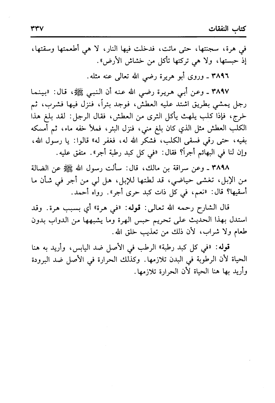 3897- وَعَنْ أَبِي هُرَيْرَةَ - رضي الله عنه - أَنَّ النَّبِيَّ - صلى الله عليه وسلم - قَالَ: «بَيْنَمَا رَجُلٌ يَمْشِي بِطَرِيقٍ اشْتَدَّ عَلَيْهِ الْعَطَشُ فَوَجَدَ بِئْرًا فَنَزَلَ فِيهَا فَشَرِبَ ثُمَّ خَرَجَ فَإِذَا كَلْبٌ يَلْهَثُ يَأْكُلُ الثَّرَى مِنْ الْعَطَشِ فَقَالَ الرَّجُلُ: لَقَدْ بَلَغَ هَذَا الْكَلْبَ مِنْ الْعَطَشِ مِثْلُ الَّذِي كَانَ بَلَغَ مِنِّي فَنَزَلَ الْبِئْرَ فَمَلَأَ خُفَّهُ مَاءً ثُمَّ أَمْسَكَهُ بِفِيهِ حَتَّى رَقِيَ فَسَقَى الْكَلْبَ فَشَكَرَ اللَّهُ لَهُ فَغَفَرَ لَهُ» . قَالُوا: يَا رَسُولَ اللَّهِ وَإِنَّ لَنَا فِي الْبَهَامِ أَجْرًا؟ فَقَالَ: «فِي كُلِّ كَبِدٍ رَطْبَةٍ أَجْرٌ» . مُتَّفَقٌ عَلَيْه.