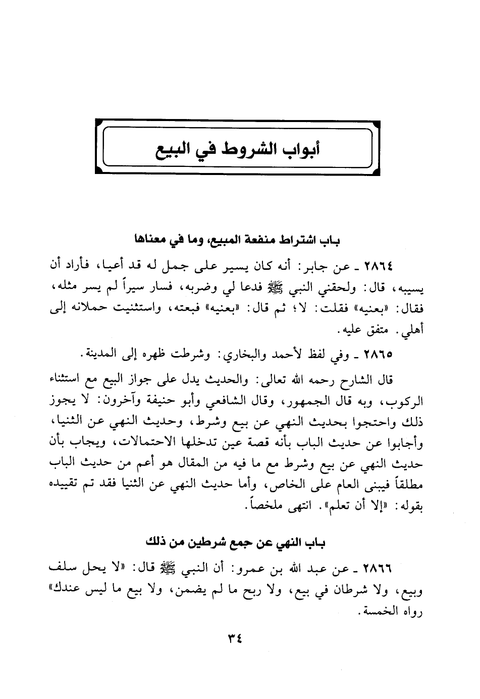 قَالَ الشَّارِحُ رَحِمَهُ اللهُ تَعَالَى: وَالْحَدِيثِ يَدُلُّ عَلَى جَوَازِ الْبَيْعِ مَعَ اسْتِثْنَاءِ الرُّكُوبِ، وَبِهِ قَالَ الْجُمْهُورُ، وَقَالَ الشَّافِعِيُّ وَأَبُو حَنِيفَةَ وَآخَرُونَ: لا يَجُوزُ ذَلِكَ، وَاحْتَجُّوا بِحَدِيثِ النَّهْيِ عَنْ بَيْعٍ وَشَرْطٍ وَحَدِيثِ النَّهْيِ عَنْ الثُّنْيَا، وَأَجَابُوا عَنْ حَدِيثِ الْبَابِ بِأَنَّهُ قِصَّةُ عَيْنٍ تَدْخُلُهَا الاحْتِمَالاتُ وَيُجَابُ بِأَنَّ حَدِيثَ النَّهْيِ عَنْ بَيْعٍ وَشَرْطٍ مَعَ مَا فِيهِ مِنْ الْمَقَالِ هُوَ أَعَمُّ مِنْ حَدِيثِ الْبَابِ مُطْلَقًا فَيُبْنَى الْعَامُّ عَلَى الْخَاصِّ. وَأَمَّا حَدِيثُ النَّهْيِ عَنْ الثُّنْيَا فَقَدْ تم تَقَدَّمَ تَقْيِيدُهُ بِقَوْلِهِ: إلا أَنْ يُعْلَمَ انْتَهَى مُلَخَّصًا.