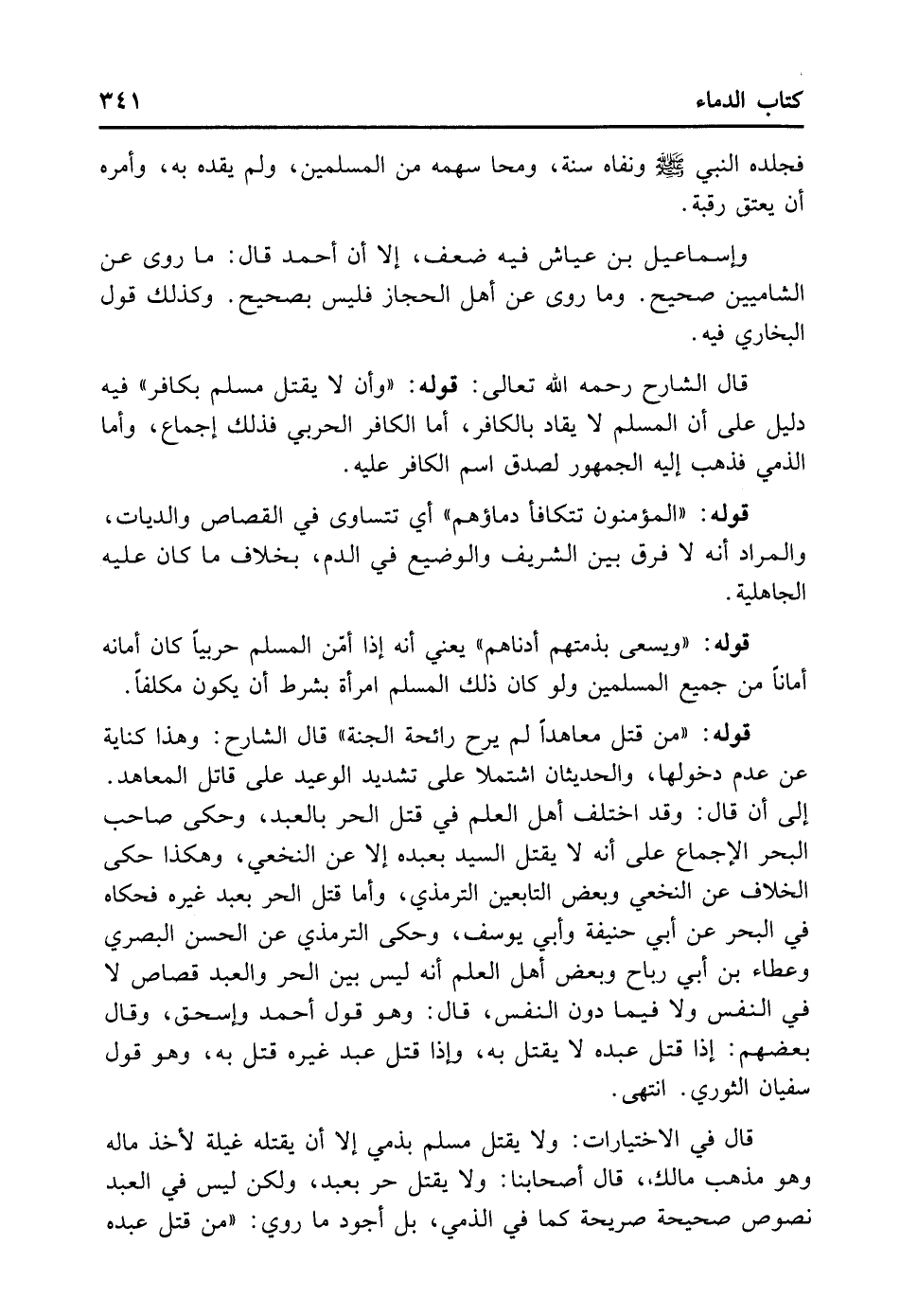 قَالَ الشَّارِحُ رَحِمَهُ اللهُ تَعَالَى قَوْلُهُ: «وَأَنْ لا يُقْتَلَ مُسْلِمٌ بِكَافِرٍ» فِيهِ دَلِيلٌ عَلَى أَنَّ الْمُسْلِمَ لا يُقَادُ بِالْكَافِرِ، أَمَّا الْكَافِرُ الْحَرْبِيُّ فَذَلِكَ إجْمَاعٌ وَأَمَّا الذِّمِّيُّ فَذَهَبَ إلَيْهِ الْجُمْهُورُ لِصِدْقِ اسْمِ الْكَافِرِ عَلَيْهِ.