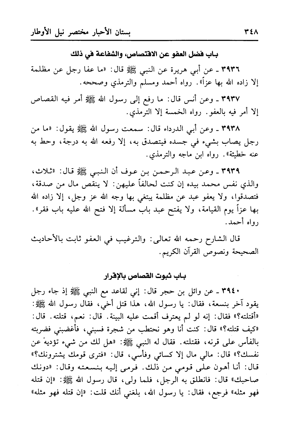 3940- عَنْ وَائِلِ بْنِ حُجْرٍ قَالَ: إنِّي لَقَاعِدٌ مَعَ النَّبِيِّ - صلى الله عليه وسلم - إذْ جَاءَ رَجُلٌ يَقُودُ آخَرَ بِنِسْعَةٍ فَقَالَ: يَا رَسُولَ اللَّه هَذَا قَتَلَ أَخِي. فَقَالَ رَسُولُ اللَّهِ - صلى الله عليه وسلم -: ... «أَقَتَلْتَهُ» ؟ فَقَالَ: إنَّهُ لَوْ لَمْ يَعْتَرِفْ أَقَمْت عَلَيْهِ الْبَيِّنَةَ. قَالَ: نَعَمْ قَتَلْتُهُ. قَالَ: «كَيْفَ قَتَلْتَهُ» ؟ قَالَ: كُنْتُ أَنَا وَهُوَ نَحْتَطِبُ مِنْ شَجَرَةٍ فَسَبَّنِي فَأَغْضَبَنِي فَضَرَبْتُهُ بِالْفَأْسِ عَلَى قَرْنِهِ فَقَتَلْته. فَقَالَ لَهُ النَّبِيُّ - صلى الله عليه وسلم -: «هَلْ لَك مِنْ شَيْءٍ تُؤَدِّيهِ عَنْ نَفْسِك» ؟ قَالَ: مَا لِي مَالٌ إلا كِسَائِي وَفَأْسِي. قَالَ: «فَتَرَى قَوْمَك يَشْتَرُونَك» ؟ قَالَ: أَنَا أَهْوَنُ عَلَى قَوْمِي مِنْ ذَاكَ فَرَمَى إلَيْهِ بِنِسْعَتِهِ. وَقَالَ: «دُونَك صَاحِبَك» . قَالَ: فَانْطَلَقَ بِهِ الرَّجُلُ فَلَمَّا وَلَّى قَالَ رَسُولُ اللَّهِ - صلى الله عليه وسلم -: «إنْ قَتَلَهُ فَهُوَ مِثْلُهُ» . فَرَجَعَ فَقَالَ: يَا رَسُولَ اللَّهِ بَلَغَنِي أَنَّكَ قُلْتَ: «إنْ قَتَلَهُ فَهُوَ مِثْلُهُ» .