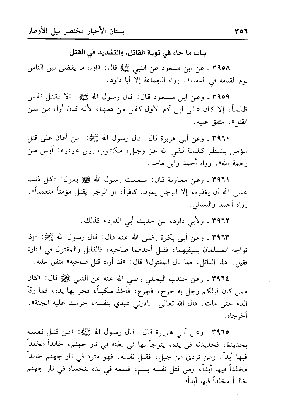 3958- عَنْ ابْنِ مَسْعُودٍ عَنْ النَّبِيِّ - صلى الله عليه وسلم - قَالَ: «أَوَّلُ مَا يُقْضَى بَيْنَ النَّاسِ يَوْمَ الْقِيَامَةِ فِي الدِّمَاءِ» . رَوَاهُ الْجَمَاعَةُ إلا أَبَا دَاوُد.