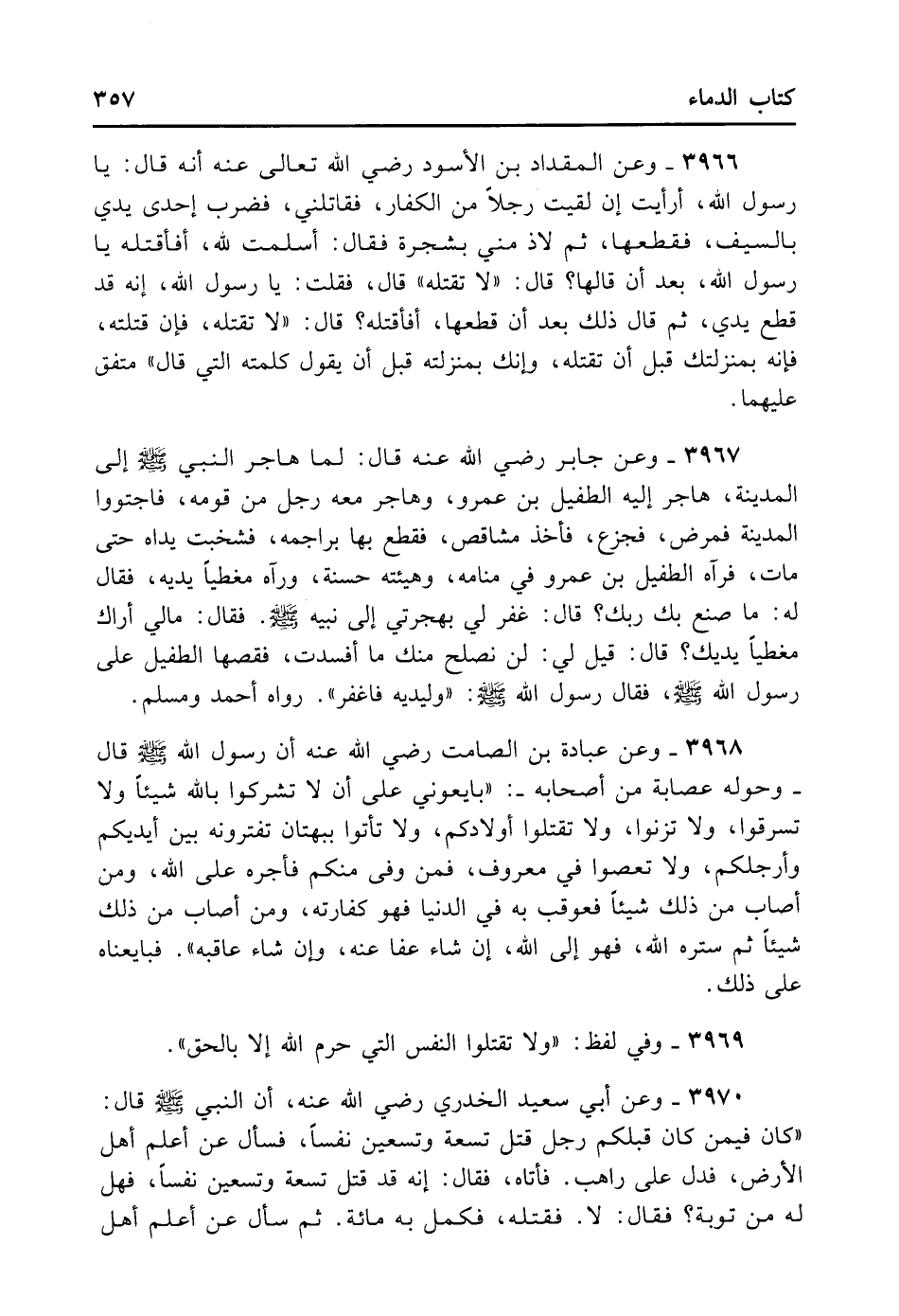 3966- وَعَنْ الْمِقْدَادِ بْنِ الأَسْوَدِ رَضِيَ اللهُ تَعَالَى عَنْهُ أَنَّهُ قَالَ: يَا ... رَسُولَ اللَّهِ أَرَأَيْت إنْ لَقِيتُ رَجُلًا مِنْ الْكُفَّارِ فَقَاتَلَنِي فَضَرَبَ إحْدَى يَدَيَّ بِالسَّيْفِ فَقَطَعَهَا ثُمَّ لاذَ مِنِّي بِشَجَرَةٍ فَقَالَ: أَسْلَمْت لِلَّهِ أَفَأَقْتُلُهُ يَا رَسُولَ اللَّهِ بَعْدَ أَنْ قَالَهَا؟ قَالَ: «لا تَقْتُلْهُ» . قَالَ: فَقُلْت يَا رَسُولَ اللَّهِ إنَّهُ قَطَعَ يَدِي ثُمَّ قَالَ ذَلِكَ بَعْدَ أَنْ قَطَعَهَا أَفَأَقْتُلُهُ؟ قَالَ: «لا تَقْتُلْهُ فَإِنْ قَتَلْتَهُ فَإِنَّهُ بِمَنْزِلَتِك قَبْلَ أَنْ تَقْتُلَهُ وَإِنَّك بِمَنْزِلَتِهِ قَبْلَ أَنْ يَقُولَ كَلِمَتَهُ الَّتِي قَالَ» . مُتَّفَقٌ عَلَيْهِمَا.