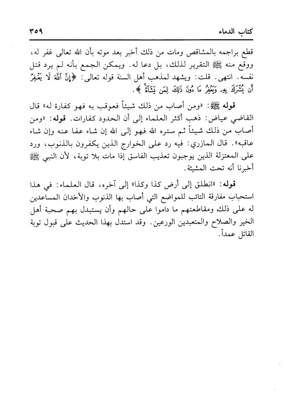 قَوْلُهُ: «وَمَنْ أَصَابَ مِنْ ذَلِكَ شَيْئًا فَعُوقِبَ بِهِ فَهُوَ كَفَّارَةٌ لَهُ» قَالَ الْقَاضِي عِيَاضٌ: ذَهَبَ أَكْثَرُ الْعُلَمَاءِ إلَى أَنَّ الْحُدُودَ كَفَّارَاتٌ. قَوْلُهُ: «وَمَنْ أَصَابَ مِنْ ذَلِكَ شَيْئًا ثُمَّ سَتَرَهُ اللهُ فَهُوَ إلَى اللَّهِ إنْ شَاءَ عَفَا عَنْهُ وَإِنْ شَاءَ عَاقَبَهُ» قَالَ الْمَازِرِيُّ: فِيهِ رَدٌّ عَلَى الْخَوَارِجِ الَّذِينَ يُكَفِّرُونَ بِالذُّنُوبِ، وَرَدٌّ عَلَى الْمُعْتَزِلَةِ الَّذِينَ يُوجِبُونَ تَعْذِيبَ الْفَاسِق إذَا مَاتَ بِلا تَوْبَةٍ، لأَنَّ النَّبِيَّ - صلى الله عليه وسلم - أَخْبَرَنَا بِأَنَّهُ تَحْتَ الْمَشِيئَةِ.
