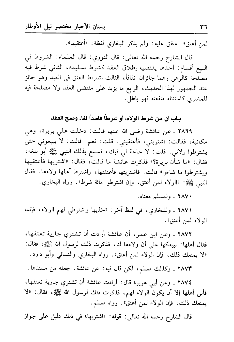 2869- عَنْ عَائِشَةَ رَضِيَ اللَّهُ عَنْهَا قَالَتْ: دَخَلَتْ عَلَيَّ بَرِيرَةُ وَهِيَ مُكَاتَبَةٌ فَقَالَتْ: اشْتَرِينِي فَأَعْتِقِينِي، قُلْت: نَعَمْ، قَالَتْ: لا يَبِيعُونِي حَتَّى يَشْتَرِطُوا وَلائِي، قُلْت: لا حَاجَةَ لِي فِيكِ، فَسَمِعَ بِذَلِكَ النَّبِيُّ - صلى الله عليه وسلم - أَبوْ بَلَغَهُ، فَقَالَ: «مَا شَأْنُ بَرِيرَةَ» ؟ فَذَكَرَتْ عَائِشَةُ مَا قَالَتْ، فَقَالَ: «اشْتَرِيهَا فَأَعْتِقِيهَا وَيَشْتَرِطُوا مَا شَاءُوا» . قَالَتْ: فَاشْتَرَيْتُهَا فَأَعْتَقْتُهَا، وَاشْتَرَطَ أَهْلُهَا وَلاءَهَا، فَقَالَ النَّبِيُّ - صلى الله عليه وسلم -: «الْوَلاءُ لِمَنْ أَعْتَقَ وَإِنْ اشْتَرَطُوا مِائَةَ شَرْطٍ» . رَوَاهُ الْبُخَارِيُّ.