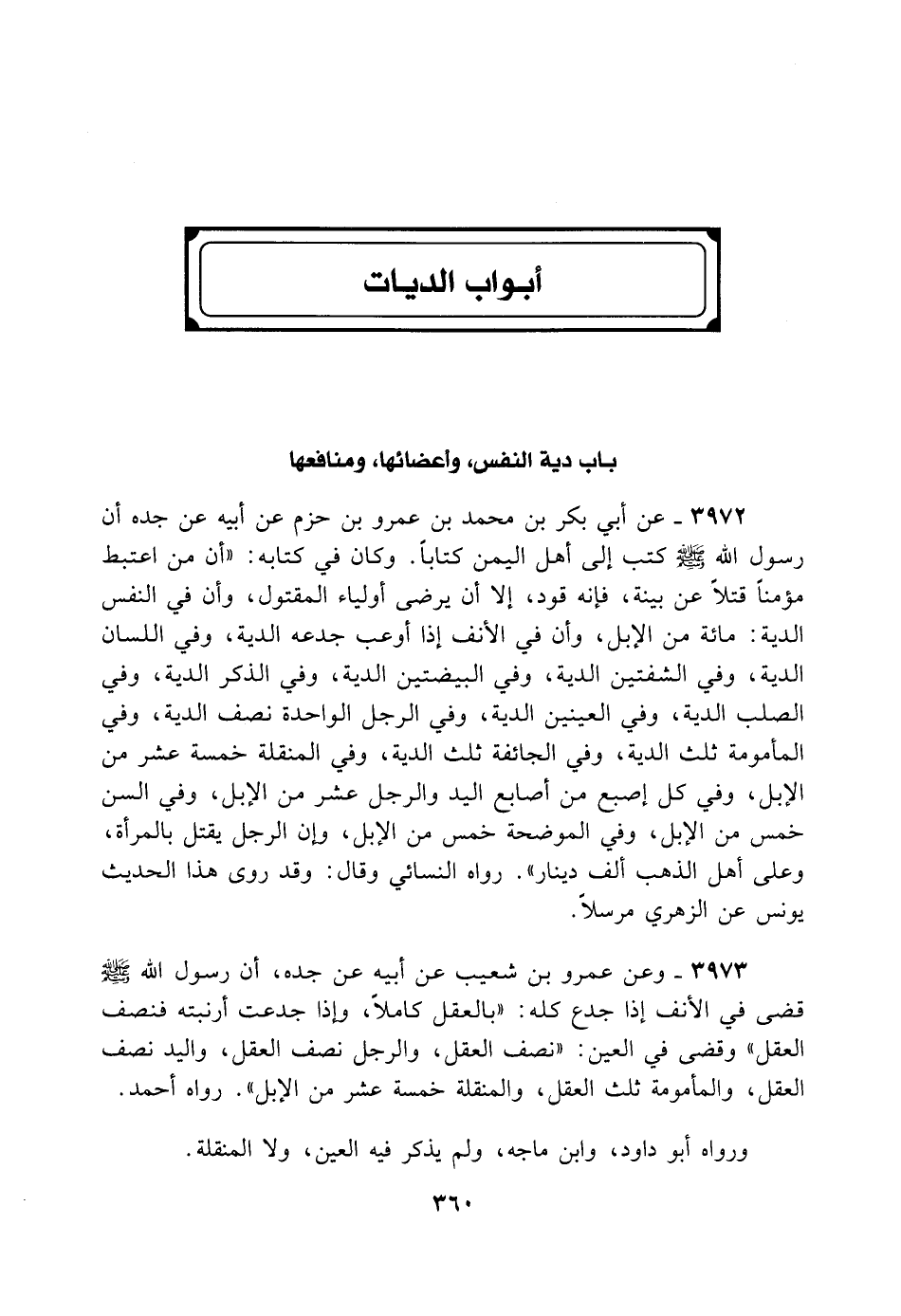3972- عَنْ أَبِي بَكْرِ بْنِ مُحَمَّدِ بْنِ عَمْرِو بْنِ حَزْمٍ عَنْ أَبِيهِ عَنْ جَدِّهِ أَنَّ رَسُولَ اللَّهِ - صلى الله عليه وسلم - كَتَبَ إلَى أَهْلِ الْيَمَنِ كِتَابًا، وَكَانَ فِي كِتَابِهِ: «أَنَّ مَنْ اعْتَبَطَ مُؤْمِنًا قَتْلًا عَنْ بَيِّنَةٍ فَإِنَّهُ قَوَدٌ، إلا أَنْ يَرْضَى أَوْلِيَاءُ الْمَقْتُولِ، وَأَنَّ فِي النَّفْسِ الدِّيَةَ مِائَةً مِنْ الإِبِلِ، وَأَنَّ فِي الأَنْفِ إذَا أُوعِبَ جَدْعُهُ الدِّيَةَ، وَفِي اللِّسَانِ الدِّيَةَ، وَفِي الشَّفَتَيْنِ الدِّيَةَ وَفِي الْبَيْضَتَيْنِ الدِّيَةَ، وَفِي الذَّكَرِ الدِّيَةَ، وَفِي الصُّلْبِ الدِّيَةَ، وَفِي الْعَيْنَيْنِ الدِّيَةَ، وَفِي الرِّجْلِ الْوَاحِدَةِ نِصْفَ الدِّيَةِ، وَفِي الْمَأْمُومَةِ ثُلُثَ الدِّيَةِ، وَفِي الْجَائِفَةِ ثُلُثَ الدِّيَةِ، وَفِي الْمُنَقِّلَةِ خَمْسَةَ عَشَرَ مِنْ الإِبِلِ، وَفِي كُلِّ إصْبَعٍ مِنْ أَصَابِعِ الْيَدِ، وَالرِّجْلِ عَشْرًا مِنْ الإِبِلِ، وَفِي السِّنِّ خَمْس مِنْ الإِبِلِ، وَفِي الْمُوضِحَةِ خَمْسًا مِنْ الإِبِلِ وَأَنَّ الرَّجُلَ يُقْتَلُ بِالْمَرْأَةِ، وَعَلَى أَهْلِ الذَّهَبِ أَلْفُ دِينَارٍ» . رَوَاهُ النَّسَائِيّ وَقَالَ: وَقَدْ رَوَى هَذَا الْحَدِيثَ يُونُسُ عَنْ الزُّهْرِيِّ مُرْسَلًا.