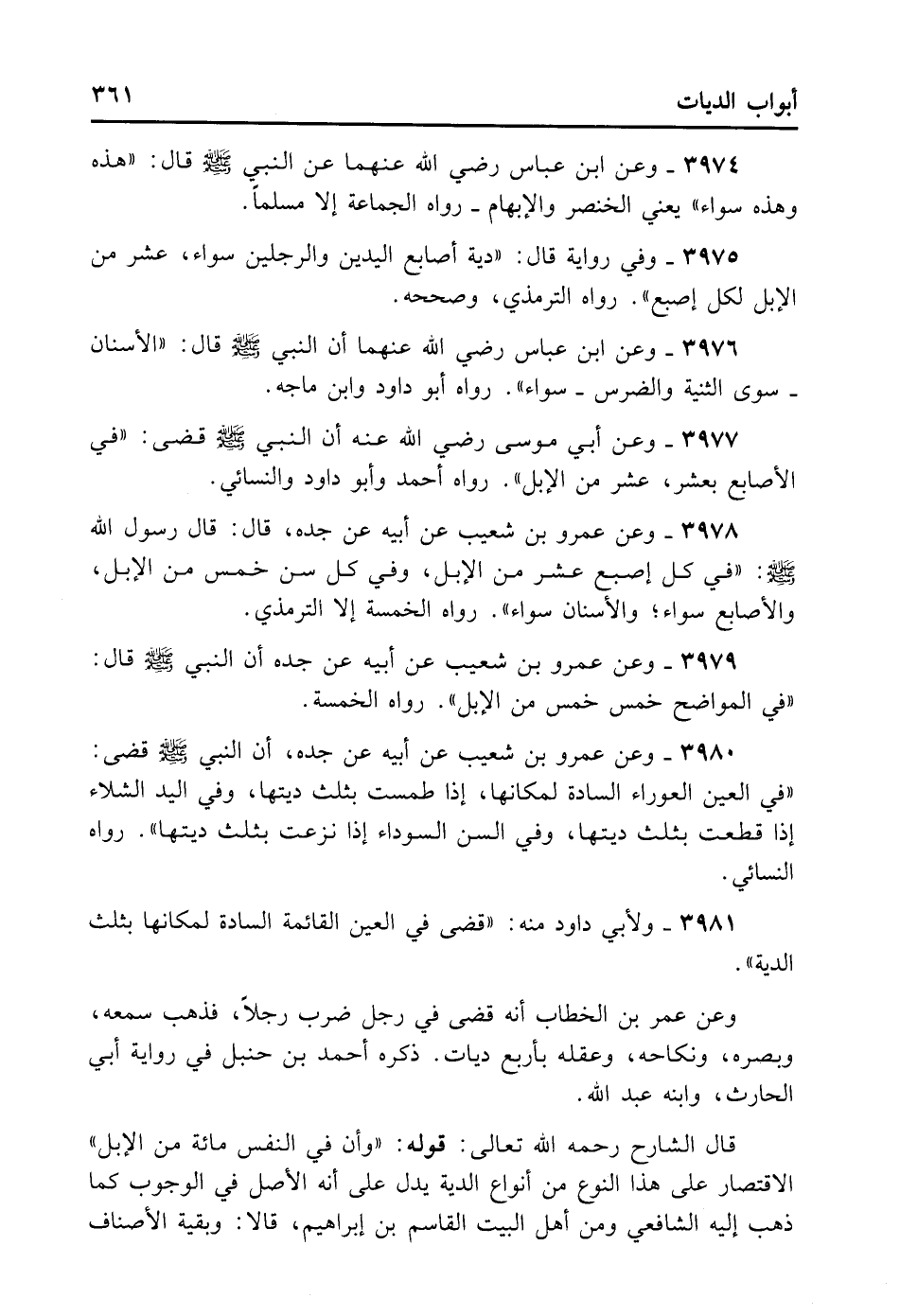 3978- وَعَنْ عَمْرِو بْنِ شُعَيْبٍ عَنْ أَبِيهِ عَنْ جَدِّهِ قَالَ: قَالَ رَسُولُ اللَّهِ - صلى الله عليه وسلم -: «فِي كُلِّ أُصْبُعٍ عَشْرٌ مِنْ الإِبِلِ، وَفِي كُلِّ سِنٍّ خَمْسٌ مِنْ الإِبِلِ، وَالأَصَابِعُ سَوَاءٌ، وَالأَسْنَانُ سَوَاءٌ» . رَوَاهُ الْخَمْسَةُ إلا التِّرْمِذِيَّ.