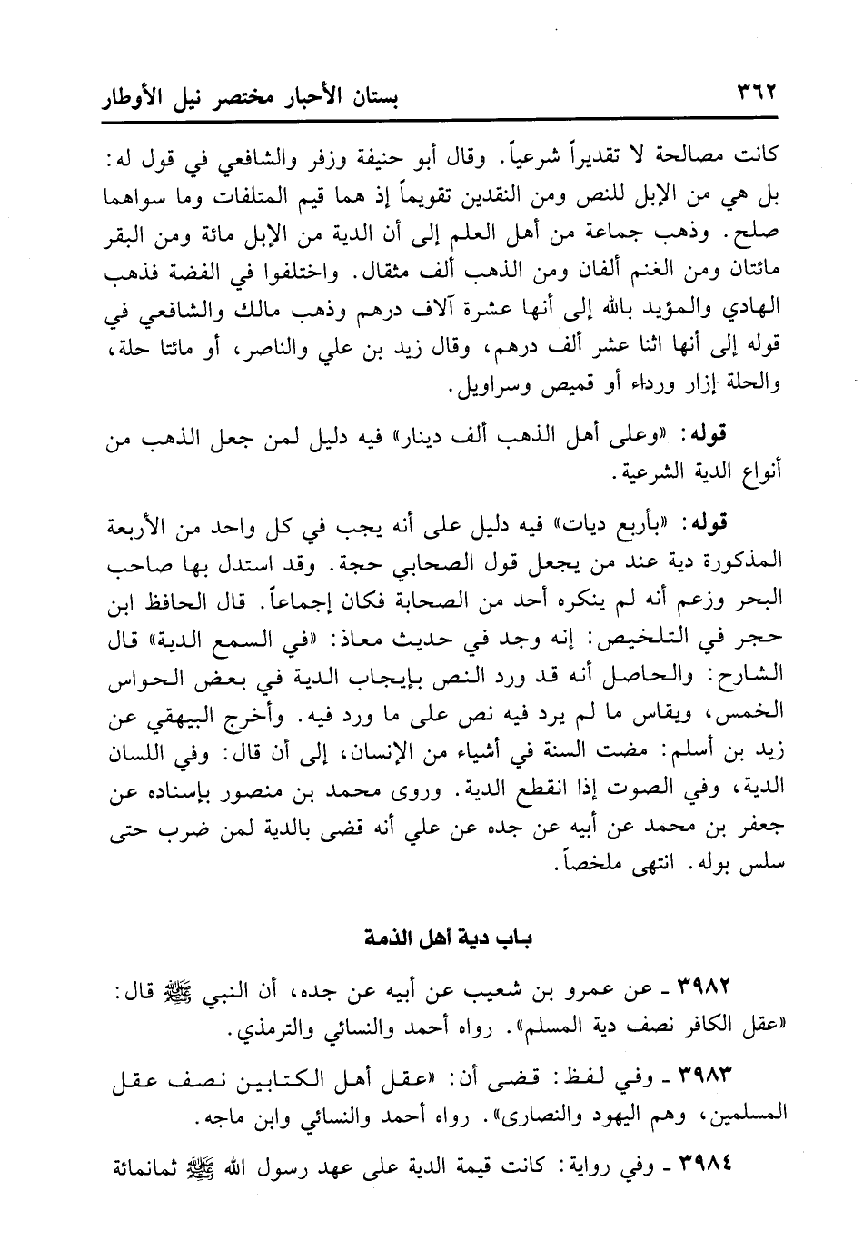 3983- وَفِي لَفْظٍ: قَضَى أَنَّ عَقْلَ أَهْلِ الْكِتَابَيْنِ نِصْفُ عَقْلِ الْمُسْلِمِينَ وَهُمْ الْيَهُودِ وَالنَّصَارَى. رَوَاهُ أَحْمَدُ وَالنَّسَائِيُّ وَابْنُ مَاجَةْ.