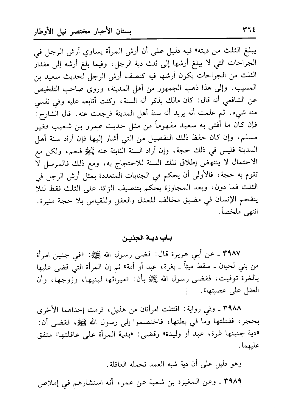 يَبْلُغَ الثُّلُثَ مِنْ دِيَتَهُ» فِيهِ دَلِيلٌ عَلَى أَنَّ أَرْشَ الْمَرْأَةِ يُسَاوِي أَرْشَ الرَّجُل فِي الْجِرَاحَاتِ الَّتِي لا يَبْلُغُ أَرْشُهَا إلَى ثُلُثِ دِيَةِ الرَّجُلِ وَفِيمَا بَلَغَ أَرْشُهُ إلَى مِقْدَارِ الثُّلُثِ مِنْ الْجِرَاحَاتِ يَكُون أَرْشُهُ فِيهِ كَنِصْفِ أَرْشِ الرَّجُلِ لِحَدِيثِ سَعِيدِ بْنِ الْمُسَيِّبِ ِ وَإِلَى هَذَا ذَهَبَ الْجُمْهُورُ مِنْ أَهْلِ الْمَدِينَةِ. وَرَوَى صَاحِبُ التَّلْخِيصِ عَنْ الشَّافِعِيِّ أَنَّهُ قَالَ: كَانَ مَالِكٌ يَذْكُرُ أَنَّهُ السُّنَّةُ وَكُنْت أُتَابِعُهُ عَلَيْهِ وَفِي نَفْسِي مِنْهُ شَيْءٌ ثُمَّ عَلِمْت أَنَّهُ يُرِيدُ أَنَّهُ سُنَّةُ أَهْلِ الْمَدِينَةِ فَرَجَعْت عَنْهُ قَالَ الشَّارِحُ: فَإِنْ كَانَ مَا أَفْتَى بِهِ سَعِيدٌ مَفْهُومًا مِنْ مِثْل حَدِيثِ عَمْرِو بْنِ شُعَيْبٍ فَغَيْرُ مُسَلَّمٍ، وَإِنْ كَانَ حَفِظَ ذَلِكَ التَّفْصِيلَ مِنْ الَّتِي أَشَارَ إلَيْهَا فَإِنْ أَرَادَ سُنَّةَ أَهْلِ الْمَدِينَةِ فَلَيْسَ فِي ذَلِكَ حُجَّةٌ وَإِنْ أَرَادَ السُّنَّةَ الثَّابِتَةَ عَنْهُ - صلى الله عليه وسلم - فَنَعَمْ، وَلَكِنْ مَعَ الِاحْتِمَالِ لا يَنْتَهِضُ إطْلاقُ تِلْكَ السُّنَّةِ لِلِاحْتِجَاجِ بِهِ، وَمَعَ ذَلِكَ فَالْمُرْسَلُ لا