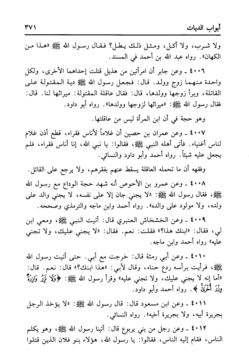 4008- وَعَنْ عَمْرِو بْنِ الأَحْوَصِ أَنَّهُ شَهِدَ حِجَّةَ الْوَدَاعِ مَعَ رَسُولِ اللَّهِ - صلى الله عليه وسلم -، فَقَالَ رَسُولُ اللَّهِ - صلى الله عليه وسلم -: «لا يَجْنِي جَانٍ إلا عَلَى نَفْسِهِ، لا يَجْنِي وَالِدٌ عَلَى وَلَدِهِ، وَلا مَوْلُودٌ عَلَى وَالِدِهِ» . رَوَاهُ أَحْمَدُ وَابْنُ مَاجَةْ وَالتِّرْمِذِيُّ وَصَحَّحَهُ.