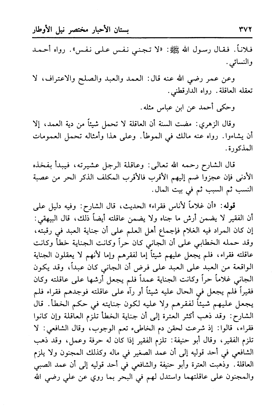 قَوْلُهُ: (أَنَّ غُلامًا لأُنَاسٍ فُقَرَاءَ) وَفِي الْحَدِيثِ قَالَ الشَّارِحُ: وَفِيهِ دَلِيلٌ عَلَى أَنَّ الْفَقِيرَ لا يَضْمَنُ أَرْشَ مَا جَنَاهُ وَلا يَضْمَنُ عَاقِلَتَهُ أَيْضًا ذَلِكَ. قَالَ الْبَيْهَقِيُّ: إنْ كَانَ الْمُرَادُ فِيهِ الْغُلامَ فَإِجْمَاعُ أَهْلِ الْعِلْمِ عَلَى أَنَّ جِنَايَةَ الْعَبْدِ فِي رَقَبَتِهِ، وَقَدْ حَمَلَهُ الْخَطَّابِيِّ عَلَى أَنَّ الْجَانِيَ كَانَ حُرًّا وَكَانَتْ الْجِنَايَةُ خَطَأً وَكَانَتْ عَاقِلَتُهُ فُقَرَاءَ، فَلَمْ يَجْعَلْ عَلَيْهِمْ شَيْئًا إمَّا لِفَقْرِهِمْ وَإِمَّا لأَنَّهُمْ لا يَعْقِلُونَ الْجِنَايَةَ الْوَاقِعَةَ مِنْ الْعَبْدِ عَلَى الْعَبْدِ عَلَى فَرْضِ أَنَّ الْجَانِيَ كَانَ عَبْدًا، وَقَدْ يَكُونُ الْجَانِي غُلامًا حُرًّا وَكَانَتْ الْجِنَايَةُ عَمْدًا فَلَمْ يَجْعَلْ أَرْشَهَا عَلَى عَاقِلَتِهِ وَكَانَ فَقِيرًا فَلَمْ يَجْعَلْ فِي الْحَالِ عَلَيْهِ شَيْئًا أَوْ رَآهُ عَلَى عَاقِلَتِهِ فَوَجَدَهُمْ فُقَرَاءَ فَلَمْ يَجْعَلْ عَلَيْهِمْ شَيْئًا لِفَقْرِهِمْ وَلا عَلَيْهِ لِكَوْنِ جِنَايَتِهِ فِي حُكْمِ الْخَطَأ. قَالَ الشَّارِحُ: وَقَدْ ذَهَبَ أَكْثَرُ الْعِتْرَةِ إلَى أَنَّ جِنَايَةَ الْخَطَأ تَلْزَمُ الْعَاقِلَةَ وَإِنْ كَانُوا فُقَرَاءَ. قَالُوا: إذَا شُرِعَتْ لِحَقْنِ دَمِ الْخَاطِئِ تَعَمَّ الْوُجُوبُ. وَقَالَ الشَّافِعِيُّ: لا تَلْزَمُ الْفَقِيرَ. وَقَالَ أَبُو حَنِيفَةَ: تَلْزَمُ الْفَقِيرَ إذَا كَانَ لَهُ حِرْفَةٌ وَعَمَلٌ. وَقَدْ ذَهَبَ