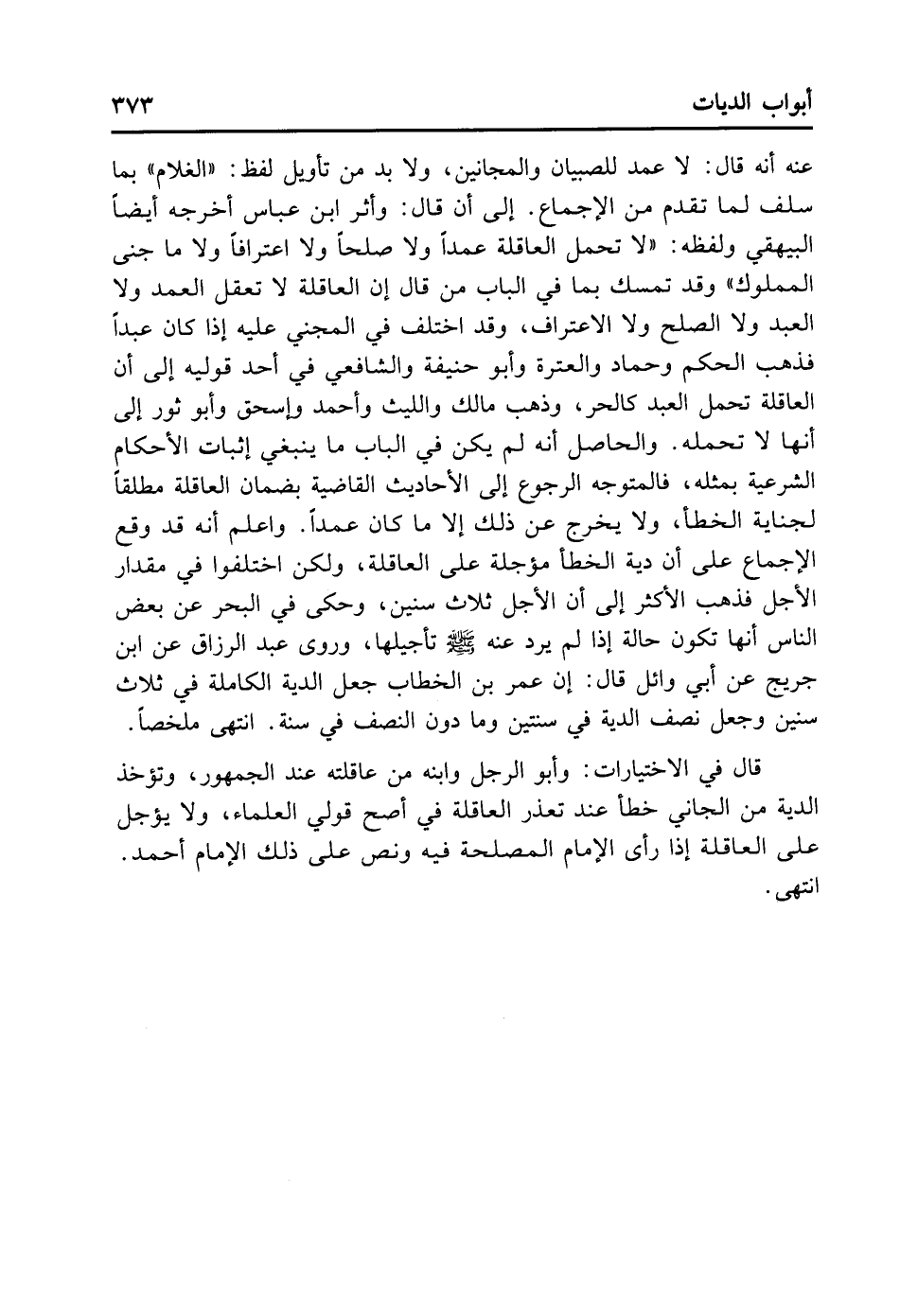 عنه - أَنَّهُ قَالَ: لا عَمْدَ لِلصِّبْيَانِ وَالْمَجَانِينَ، وَلا بُدَّ مِنْ تَأْوِيلِ لَفْظِ: (الْغُلامِ) بِمَا سَلَفَ لِمَا تَقَدَّمَ مِنْ الإِجْمَاعِ. إلى أن قَالَ: وَأَثَرُ ابْنِ عَبَّاسٍ أَخْرَجَهُ أَيْضًا الْبَيْهَقِيُّ، وَلَفْظُهُ: «لا تَحْمِلُ الْعَاقِلَةُ عَمْدًا وَلا صُلْحًا وَلا اعْتِرَافًا وَلا مَا جَنَى الْمَمْلُوكُ) ، وَقَدْ تَمَسَّكَ بِمَا فِي الْبَابِ مَنْ قَالَ: إنَّ الْعَاقِلَةَ لا تَعْقِلُ الْعَمْدَ وَلا الْعَبْدَ وَلا الصُّلْحَ وَلا الِاعْتِرَافَ. وَقَدْ اُخْتُلِفَ فِي الْمَجْنِيِّ عَلَيْهِ إذَا كَانَ عَبْدًا فَذَهَبَ الْحَكَمُ وَحَمَّادٌ وَالْعِتْرَةُ وَأَبُو حَنِيفَةَ وَالشَّافِعِيُّ فِي أَحَدِ قَوْلَيْهِ إلَى أَنَّ الْعَاقِلَةَ تَحْمِلُ الْعَبْدَ كَالْحُرِّ وَذَهَبَ مَالِكٌ وَاللَّيْثُ وَأَحْمَدُ وَإِسْحَاقُ وَأَبُو ثَوْرٍ إلَى أَنَّهَا لا تَحْمِلُهُ. وَالْحَاصِلُ أَنَّهُ لَمْ يَكُنْ فِي الْبَابِ مَا يَنْبَغِي إثْبَاتُ الأَحْكَامِ الشَّرْعِيَّةِ بِمِثْلِهِ، فَالْمُتَوَجِّهُ الرُّجُوعُ إلَى الأَحَادِيثِ وَاعْلَمْ أَنَّهُ قَدْ وَقَعَ الإِجْمَاعُ عَلَى أَنَّ دِيَةَ الْخَطَأ مُؤَجَّلَةٌ عَلَى الْعَاقِلَةِ. وَلَكِنْ اخْتَلَفُوا فِي مِقْدَارِ الأَجَلِ، فَذَهَبَ الأَكْثَرُ إلَى أَنَّ الأَجَلَ ثَلاثُ سِنِينَ. وَحُكِيَ فِي الْبَحْرِ عَنْ بَعْضِ النَّاسِ أَنَّهَا تَكُونُ حَالَّةً إذْ لَمْ يُرْوَ عَنْهُ - صلى الله عليه وسلم - تَأْجِيلُهَا. وَرُوِيَ عبد الزاق عَنْ ابْنِ جُرَيْجٍ عَنْ أَبِي وَائِلٍ قَالَ: إنَّ عُمَرَ بْنَ الْخَطَّابِ جَعَلَ الدِّيَةَ الْكَامِلَةَ فِي ثَلاثِ سِنِينَ، وَجَعَلَ نِصْفَ الدِّيَةِ فِي سَنَتَيْنِ وَمَا دُونَ النِّصْفُ فِي سنة. انْتَهَى مُلَخَّصًا.