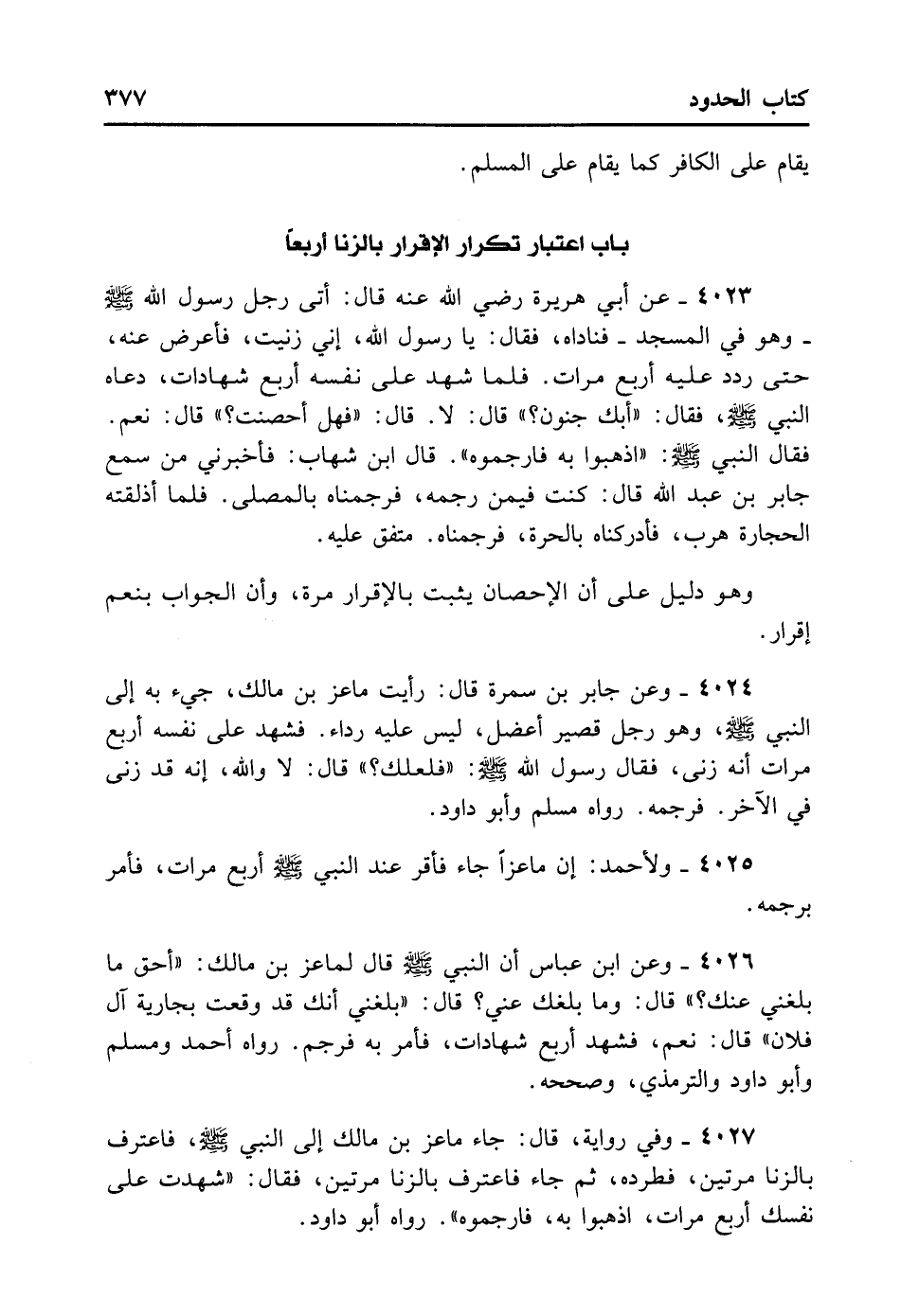 4024- وَعَنْ جَابِرِ بْنِ سَمُرَةَ قَالَ: رَأَيْتُ مَاعِزَ بْنَ مَالِكٍ جِيءَ بِهِ إلَى النَّبِيِّ - صلى الله عليه وسلم - وَهُوَ رَجُلٌ قَصِيرٌ أَعْضَلُ لَيْسَ عَلَيْهِ رِدَاءٌ، فَشَهِدَ عَلَى نَفْسِهِ أَرْبَعَ مَرَّاتٍ أَنَّهُ زَنَى، فَقَالَ رَسُولُ اللَّهِ - صلى الله عليه وسلم - «فَلَعَلَّكَ» ؟ قَالَ: لا وَاَللَّهِ إنَّهُ قَدْ زَنَى الآخِرُ فَرَجَمَهُ. رَوَاهُ مُسْلِمٌ وَأَبُو دَاوُد.