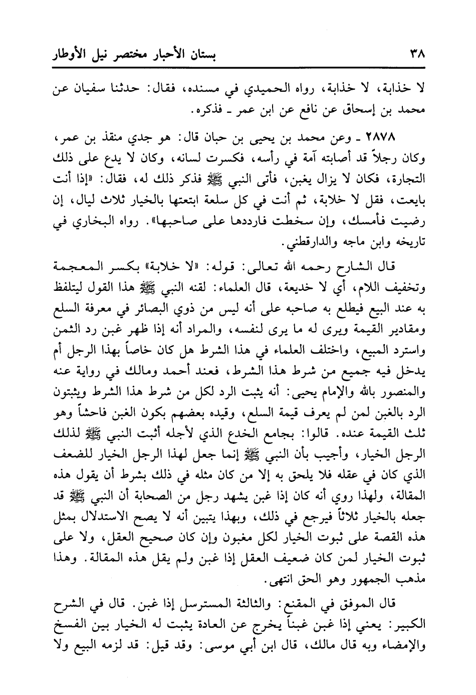 2878- وَعَنْ مُحَمَّدِ بْنِ يَحْيَى بْنِ حِبَّانَ قَالَ: هُوَ جَدِّي مُنْقِذُ بْنُ عُمَرَ وَكَانَ رَجُلًا قَدْ أَصَابَتْهُ آمَّةٌ فِي رَأْسِهِ فَكَسَرَتْ لِسَانَهُ، وَكَانَ لا يَدَعُ عَلَى ذَلِكَ التِّجَارَةَ، فَكَانَ لا يَزَالُ يُغْبَنُ، فَأَتَى النَّبِيَّ - صلى الله عليه وسلم - فَذَكَرَ ذَلِكَ لَهُ، فَقَالَ: «إذَا أَنْتَ بَايَعْتَ فَقُلْ: لا خِلابَةَ، ثُمَّ أَنْتَ فِي كُلِّ سِلْعَةٍ ابْتَعْتَهَا بِالْخِيَارِ ثَلاثَ لَيَالٍ، إنْ رَضِيتَ فَأَمْسِكْ وَإِنْ سَخِطْتَ فَارْدُدْهَا عَلَى صَاحِبِهَا» . رَوَاهُ الْبُخَارِيُّ فِي تَارِيخِهِ وَابْنُ مَاجَةْ وَالدَّارَقُطْنِيّ.