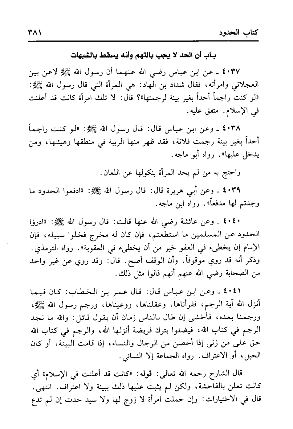 4041- وَعَنْ ابْنِ عَبَّاسٍ قَالَ: قَالَ عُمَرُ بْنُ الْخَطَّابِ: كَانَ فِيمَا أَنْزَلَ اللَّهُ آيَةُ الرَّجْمِ فَقَرَأْنَاهَا وَعَقَلْنَاهَا وَوَعَيْنَاهَا، وَرَجَمَ رَسُولُ اللَّهِ - صلى الله عليه وسلم - وَرَجَمْنَا بَعْدَهُ، فَأَخْشَى إنْ طَالَ بِالنَّاسِ زَمَانٌ أَنْ يَقُولَ قَائِلٌ: وَاَللَّهِ مَا نَجِدُ الرَّجْمَ فِي كِتَابِ اللَّهِ تَعَالَى فَيَضِلُّوا بِتَرْكِ فَرِيضَةٍ أَنْزَلَهَا اللَّهُ، وَالرَّجْمُ فِي كِتَابِ اللَّهِ حَقٌّ عَلَى مَنْ زَنَى إذَا أُحْصِنَ مِنْ الرِّجَالِ وَالنِّسَاءِ إذَا قَامَتْ الْبَيِّنَةُ أَوْ كَانَ الْحَبَلُ أَوْ الِاعْتِرَافُ. رَوَاهُ الْجَمَاعَةُ إلا النَّسَائِيّ.