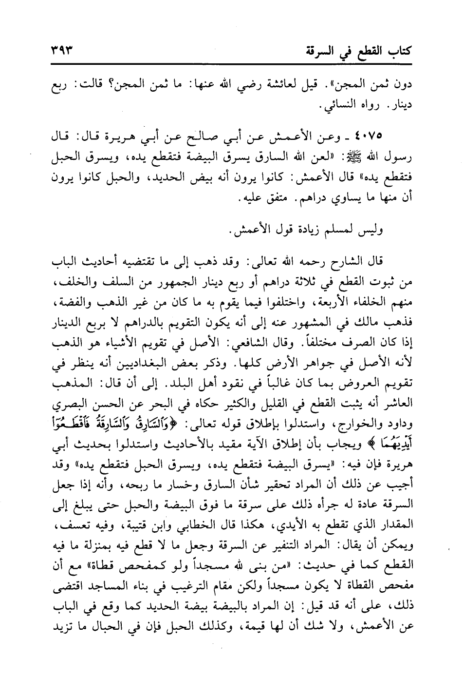 4075- وَعَنْ الأَعْمَشِ عَنْ أَبِي صَالِحٍ عَنْ أَبِي هُرَيْرَةَ قَالَ: قَالَ رَسُولُ اللَّهِ - صلى الله عليه وسلم -: «لَعَنَ اللَّهُ السَّارِقَ يَسْرِقُ الْبَيْضَةَ فَتُقْطَعُ يَدُهُ، وَيَسْرِقُ الْحَبْلَ فَتُقْطَعُ يَدُهُ» . قَالَ الأَعْمَشُ: كَانُوا يَرَوْنَ أَنَّهُ بَيْضُ الْحَدِيدِ، وَالْحَبْلُ كَانُوا يَرَوْنَ أَنَّ مِنْهَا مَا يُسَاوِي دَرَاهِمَ. مُتَّفَقٌ عَلَيْهِ.