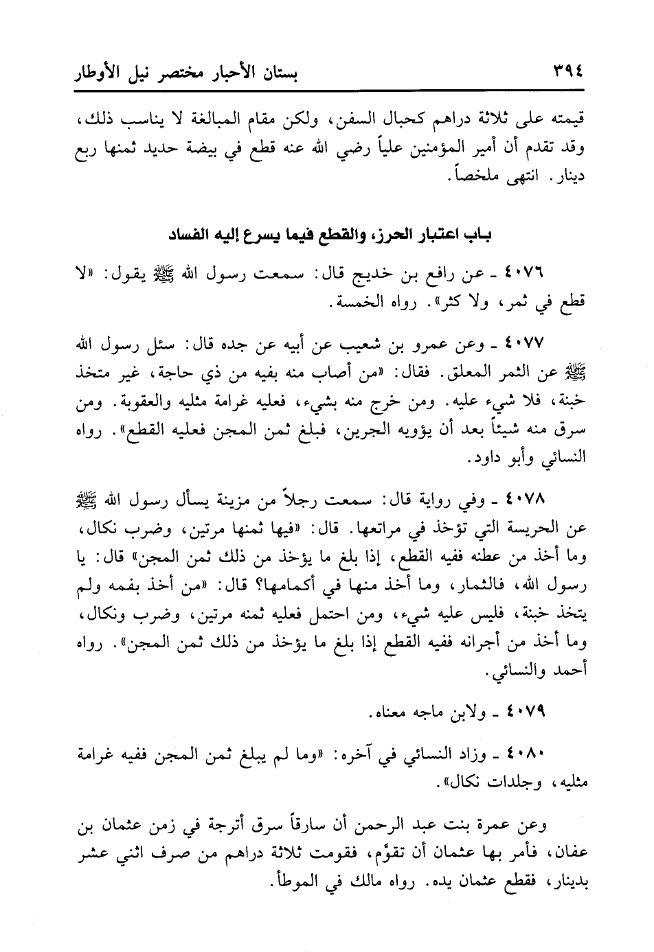 4078- وَفِي رِوَايَةٍ قَالَ: سَمِعْت رَجُلًا مِنْ مُزَيْنَةُ يَسْأَلُ رَسُولَ اللَّهِ - صلى الله عليه وسلم - عَنْ الْحَرِيسَةِ الَّتِي تُوجَدُ فِي مَرَاتِعِهَا قَالَ: «فِيهَا ثَمَنُهَا مَرَّتَيْنِ وَضَرْبُ نَكَالٍ، وَمَا أُخِذَ مِنْ عَطَنِهِ فَفِيهِ الْقَطْعُ إذَا بَلَغَ مَا يُؤْخَذُ مِنْ ذَلِكَ ثَمَنَ الْمِجَنِّ» . قَالَ: يَا رَسُولَ اللَّهِ فَالثِّمَارُ وَمَا أُخِذَ مِنْهَا فِي أَكْمَامِهَا؟ قَالَ: «مَنْ أَخَذَ بِفَمِّهِ وَلَمْ يَتَّخِذْ خُبْنَةً فَلَيْسَ عَلَيْهِ شَيْءٌ، وَمَنْ احْتَمَلَ فَعَلَيْهِ ثَمَنُهُ مَرَّتَيْنِ وَضَرْبُ نَكَالٍ، وَمَا أُخِذَ مِنْ أَجْرَانِهِ فَفِيهِ الْقَطْعُ إذَا بَلَغَ مَا يُؤْخَذُ مِنْ ذَلِكَ ثَمَنَ الْمِجَنِّ» . رَوَاهُ أَحْمَدُ وَالنَّسَائِيُّ.