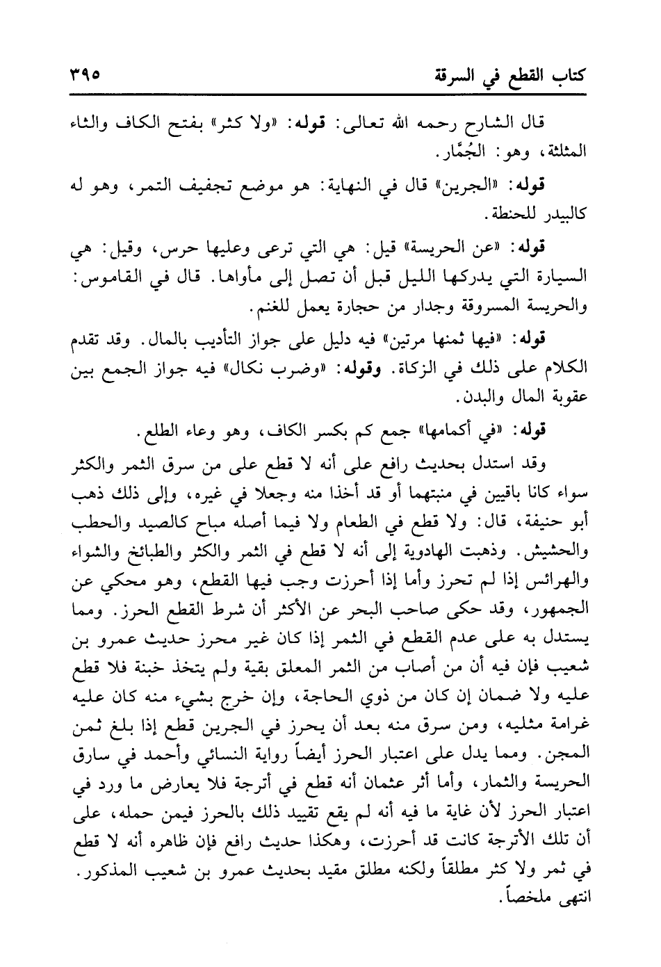 وَالْهَرَائِسِ إذَا لَمْ تُحْرَزْ، وَأَمَّا إذَا أُحْرِزَتْ وَجَبَ فِيهَا الْقَطْعُ وَهُوَ مَحْكِيٌّ عَنْ الْجُمْهُورِ. وَقَدْ حَكَى صَاحِبُ الْبَحْرِ عَنْ الأَكْثَرِ أَنَّ شَرْطَ الْقَطْعِ الْحِرْزُ. وَمِمَّا يُسْتَدَلُّ بِهِ عَلَى عَدَمِ الْقَطْعِ فِي الثَّمَرِ إذَا كَانَ غَيْرَ مُحْرَزٍ حَدِيثُ عَمْرِو بْنِ شُعَيْبٍ، فَإِنَّ فِيهِ: «إنَّ مَنْ أَصَابَ مِنْ الثَّمَرِ الْمُعَلَّقِ بِفِيهِ وَلَمْ يَتَّخِذْ خُبْنَةً فَلا قَطْعَ عَلَيْهِ وَلا ضَمَانَ إنْ كَانَ مِنْ ذَوِي الْحَاجَةِ، وَإِنْ خَرَجَ بِشَيْءٍ مِنْهُ كَانَ عَلَيْهِ غَرَامَةُ مِثْلَيْهِ وَمَنْ سَرَقَ مِنْهُ بَعْدَ أَنْ يُحْرَزَ فِي الْجَرِينِ قُطِعَ إذَا بَلَغَ ثَمَنَ الْمِجَنِّ» . وَمِمَّا يَدُلُّ عَلَى اعْتِبَارِ الْحِرْزِ أَيْضًا رِوَايَةُ النَّسَائِيّ وَأَحْمَدَ فِي سَارِقِ الْحَرِيسَةِ وَالثِّمَارِ. وَأَمَّا أَثَرُ عُثْمَانَ أَنَّهُ قَطَعَ فِي أُتْرُجَّةٍ فَلا يُعَارِضُ مَا وَرَدَ فِي اعْتِبَارِ الْحِرْزِ؛ لأَنَّ غَايَةَ مَا فِيهِ أَنَّهُ لَمْ يَقَعْ تَقْيِيدُ ذَلِكَ بِالْحِرْزِ فِيمَنْ حَمَلَهُ عَلَى أَنَّ تِلْكَ الأُتْرُجَّةَ كَانَتْ قَدْ أُحْرِزَتْ وَهَكَذَا حَدِيثُ رَافِعٍ فَإِنَّ ظَاهِرَهُ أَنَّهُ لا قَطْعَ فِي ثَمَرٍ وَلا كَثَرٍ مُطْلَقًا وَلَكِنَّهُ مُطْلَقٌ مُقَيَّدٌ بِحَدِيثِ عَمْرِو بْنِ شُعَيْبٍ الْمَذْكُورِ. انْتَهَى مُلَخَّصًا.