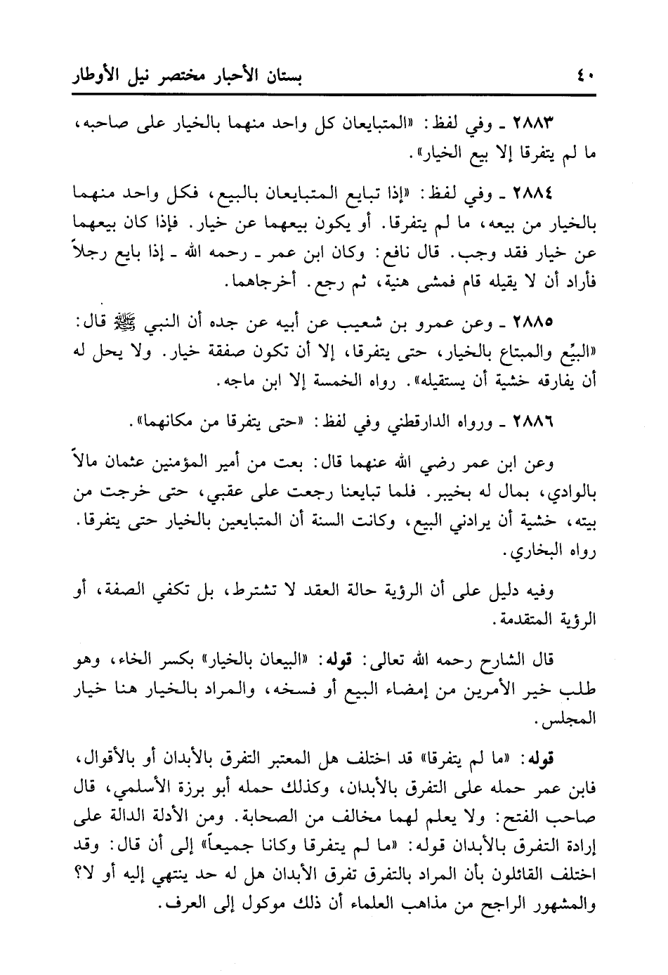 2886- وَرَوَاهُ الدَّارَقُطْنِيّ - وَفِي لَفْظٍ: «حَتَّى يَتَفَرَّقَا مِنْ مَكَانِهِمَا» . وَعَنْ ابْنِ عُمَرَ رَضِيَ اللَّهُ عَنْهُمَا قَالَ: بِعْتُ مِنْ أَمِيرِ الْمُؤْمِنِينَ عُثْمَانَ مَالًا بِالْوَادِي بِمَالٍ لَهُ بِخَيْبَرَ، فَلَمَّا تَبَايَعْنَا رَجَعْتُ عَلَى عَقِبِي حَتَّى خَرَجْتُ مِنْ بَيْتِهِ خَشْيَةَ أَنْ يُرَادَّنِي الْبَيْعَ، وَكَانَتْ السُّنَّةُ أَنَّ الْمُتَبَايِعَيْنِ بِالْخِيَارِ حَتَّى يَتَفَرَّقَا. رَوَاهُ الْبُخَارِيُّ.