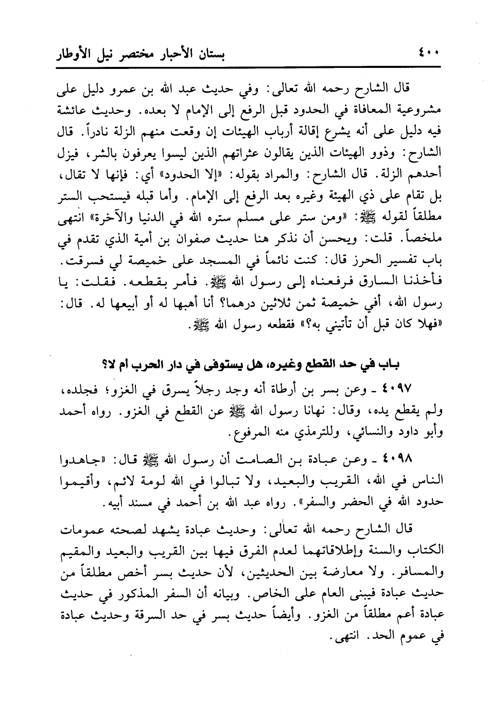 4097- عَنْ بُسْرِ بْنِ أَرْطَاةَ: أَنَّهُ وَجَدَ رَجُلًا يَسْرِقُ فِي الْغَزْوِ فَجَلَدَهُ وَلَمْ يَقْطَعْ يَدَهُ وَقَالَ: نَهَانَا رَسُولُ اللَّهِ - صلى الله عليه وسلم - عَنْ الْقَطْعِ فِي الْغَزْوِ. رَوَاهُ أَحْمَدُ وَأَبُو دَاوُد وَالنَّسَائِيُّ، وَلِلتِّرْمِذِيِّ مِنْهُ الْمَرْفُوعُ.