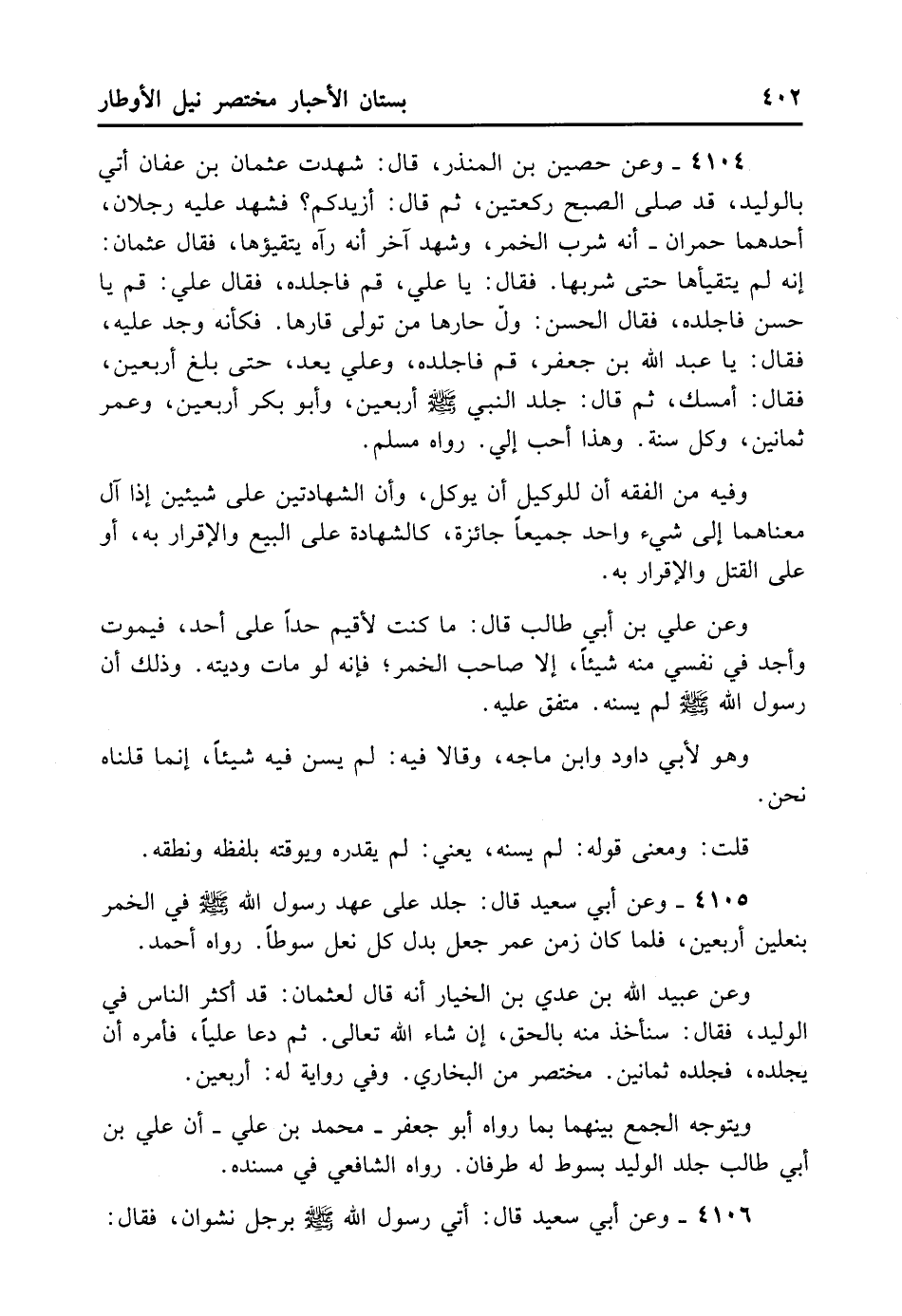 4104- وَعَنْ حُصَيْنِ بْنِ الْمُنْذِرِ قَالَ: شَهِدْت عُثْمَانَ بْنَ عَفَّانَ أُتِيَ بِالْوَلِيدِ قَدْ صَلَّى الصُّبْحَ رَكْعَتَيْنِ، ثُمَّ قَالَ: أَزِيدُكُمْ، فَشَهِدَ عَلَيْهِ رَجُلانِ أَحَدُهُمَا حُمْرَانُ أَنَّهُ شَرِبَ الْخَمْرَ، وَشَهِدَ آخَرُ أَنَّهُ رَآهُ يَتَقَيَّؤهَا، فَقَالَ عُثْمَانُ: إنَّهُ لَمْ