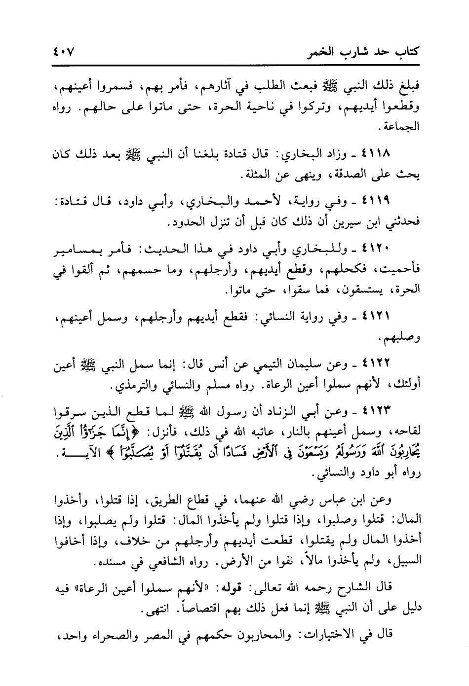 4123- وَعَنْ أَبِي الزِّنَادِ: أَنَّ رَسُولَ اللهِ - صلى الله عليه وسلم - لَمَّا قَطَعَ الَّذِينَ سَرَقُوا لِقَاحَهُ وَسَمَلَ أَعْيُنَهُمْ بِالنَّارِ عَاتَبَهُ اللَّهُ فِي ذَلِكَ، فَأَنْزَلَ {إنَّمَا جَزَاءُ الَّذِينَ يُحَارِبُونَ اللَّهَ وَرَسُولَهُ وَيَسْعَوْنَ فِي الْأَرْضِ فَسَادًا أَنْ يُقَتَّلُوا أَوْ يُصَلَّبُوا} الْآيَةَ. رَوَاهُ أَبُو دَاوُد وَالنَّسَائِيُّ.