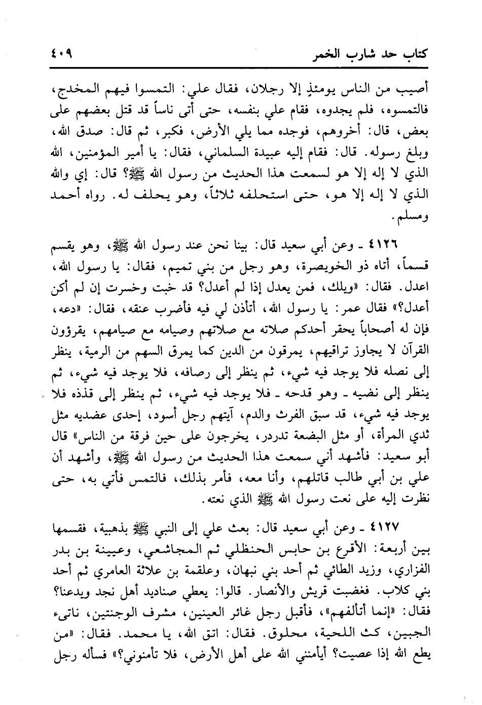 4126- وَعَنْ أَبِي سَعِيدٍ قَالَ: بَيْنَا نَحْنُ عِنْدَ رَسُولِ اللَّهِ - صلى الله عليه وسلم - وَهُوَ يَقْسِمُ قَسْمًا، أَتَاهُ ذُو الْخُوَيْصِرَةِ وَهُوَ رَجُلٌ مِنْ بَنِي تَمِيمٍ، قَالَ: يَا رَسُولَ اللَّهِ اعْدِلْ، فَقَالَ: «وَيْلَك فَمَنْ يَعْدِلُ إذَا لَمْ أَعْدِلْ؟ قَدْ خِبْت وَخَسِرْت إنْ لَمْ أَكُنْ أَعْدِلُ» . فَقَالَ عُمَرُ: يَا رَسُولَ اللَّهِ أَتَأْذَنُ لِي فِيهِ فَأَضْرِبَ عُنُقَهُ؟ فَقَالَ: ... «دَعْهُ فَإِنَّ لَهُ أَصْحَابًا يَحْقِرُ أَحَدُكُمْ صَلَاتَهُ مَعَ صَلَاتِهِمْ وَصِيَامَهُ مَعَ صِيَامِهِمْ، يَقْرَءُونَ الْقُرْآنَ لَا يُجَاوِزُ تَرَاقِيَهُمْ، يَمْرُقُونَ مِنْ الدِّينِ، كَمَا يَمْرُقُ السَّهْمُ مِنْ الرَّمِيَّةِ، يَنْظُرُ إلَى نَصْلِهِ فَلَا يُوجَدُ فِيهِ شَيْءٌ، ثُمَّ يَنْظُرُ إلَى رِصَافِهِ فَلَا يُوجَدُ فِيهِ شَيْءٌ، ثُمَّ يَنْظُرُ إلَى نَضِيِّهِ - وَهُوَ قِدْحُهُ - فَلَا يُوجَدُ فِيهِ شَيْءٌ، ثُمَّ يَنْظُرُ إلَى قُذَذِهِ فَلَا يُوجَدُ فِيهِ شَيْءٌ، قَدْ سَبَقَ الْفَرْثَ وَالدَّمَ، آيَتُهُمْ رَجُلٌ أَسْوَدُ إحْدَى عَضُدَيْهِ مِثْلُ ثَدْيِ الْمَرْأَةِ أَوْ مِثْلُ الْبَضْعَةِ تَدَرْدَرُ يَخْرُجُونَ عَلَى حِينِ فُرْقَةٍ مِنْ النَّاسِ» . قَالَ أَبُو سَعِيدٍ: فَأَشْهَدُ أَنِّي سَمِعْت هَذَا الْحَدِيثَ مِنْ رَسُولِ اللَّهِ - صلى الله عليه وسلم -، وَأَشْهَدُ أَنَّ عَلِيَّ بْنَ أَبِي طَالِبٍ قَاتَلَهُمْ وَأَنَا مَعَهُ، فَأَمَرَ بِذَلِكَ الرَّجُلِ فَالْتُمِسَ فَأُتِيَ بِهِ حَتَّى نَظَرْت إلَيْهِ عَلَى نَعْتِ رَسُولِ اللَّهِ - صلى الله عليه وسلم - الَّذِي نَعَتَهُ.
