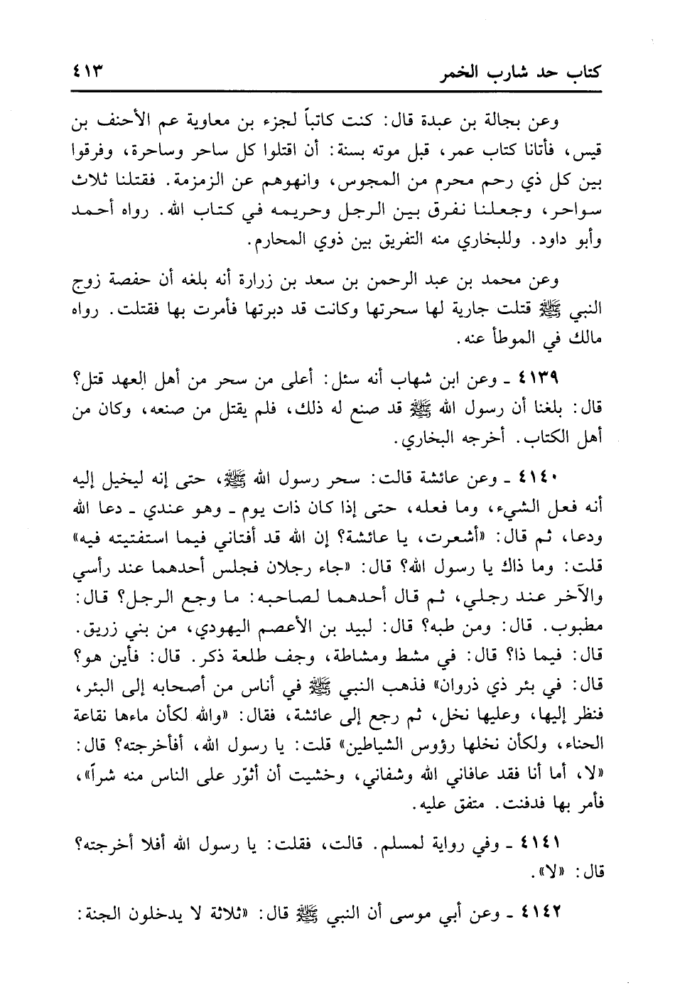 4139- وَعَنْ ابْنِ شِهَابٍ أَنَّهُ سُئِلَ: أَعَلَى مَنْ سَحَرَ مِنْ أَهْلِ الْعَهْدِ قَتْلٌ؟ قَالَ: بَلَغَنَا أَنَّ رَسُولَ اللَّهِ - صلى الله عليه وسلم - قَدْ صُنِعَ لَهُ ذَلِكَ فَلَمْ يَقْتُلْ مَنْ صَنَعَهُ، وَكَانَ مِنْ أَهْلِ الْكِتَابِ. أَخْرَجَهُ الْبُخَارِيُّ.