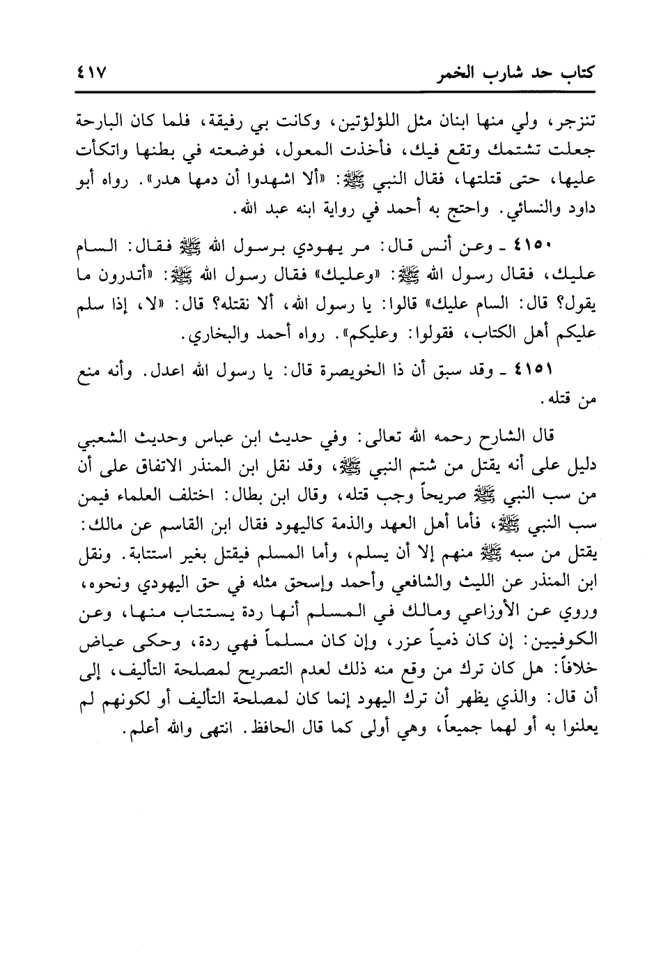 قَالَ الشَّارِحُ رَحِمَهُ اللهُ تَعَالَى: وَفِي حَدِيثِ ابْنِ عَبَّاسٍ وَحَدِيثِ الشَّعْبِيِّ دَلِيلٌ عَلَى أَنَّهُ يُقْتَلُ مَنْ شَتَمَ النَّبِيَّ - صلى الله عليه وسلم -. وَقَدْ نَقَلَ ابْنُ الْمُنْذِرِ الِاتِّفَاقَ عَلَى أَنَّ مَنْ سَبَّ النَّبِيَّ - صلى الله عليه وسلم - صَرِيحًا وَجَبَ قَتْلُهُ. وَقَالَ ابْنُ بَطَّالٍ: اخْتَلَفَ الْعُلَمَاءُ فِيمَنْ سَبَّ النَّبِيَّ - صلى الله عليه وسلم -، فَأَمَّا أَهْلُ الْعَهْدِ وَالذِّمَّةِ كَالْيَهُودِ فَقَالَ ابْنُ الْقَاسِمِ عَنْ مَالِكٍ: يُقْتَلُ مَنْ سَبَّهُ - صلى الله عليه وسلم - مِنْهُمْ إلَّا أَنْ يُسْلِمَ، وَأَمَّا الْمُسْلِمُ فَيُقْتَلُ بِغَيْرِ اسْتِتَابَةٍ. وَنَقَلَ ابْنُ الْمُنْذِرِ عَنْ اللَّيْثِ وَالشَّافِعِيِّ وَأَحْمَدَ وَإِسْحَاقَ مِثْلَهُ فِي حَقِّ الْيَهُودِي وَنَحْوِهِ. وَرُوِيَ عَنْ الْأَوْزَاعِيِّ وَمَالِكٍ فِي الْمُسْلِمِ أَنَّهَا رِدَّةٌ يُسْتَتَابُ مِنْهَا. وَعَنْ الْكُوفِيِّينَ إِنْ كَانَ ذِمِّيًّا عُزِّرَ، وَإِنْ كَانَ مُسْلِمًا فَهِيَ رِدَّةٌ. وَحَكَى عِيَاضٌ خِلَافًا هَلْ كَانَ تَرْكُ مَنْ وَقَعَ مِنْهُ ذَلِكَ لِعَدَمِ التَّصْرِيحِ أَوْ لِمَصْلَحَةِ التَّأْلِيفِ. إلى أن قال: وَاَلَّذِي يَظْهَرُ أَنَّ تَرْكَ قَتْلِ الْيَهُودِ إنَّمَا كَانَ لِمَصْلَحَةِ التَّأْلِيفِ أَوْ لِكَوْنِهِمْ لَمْ يُعْلِنُوا بِهِ أَوْ لَهُمَا جَمِيعًا وَهُوَ أَوْلَى كَمَا قَالَ الْحَافِظُ. انْتَهَى. والله أعلم.