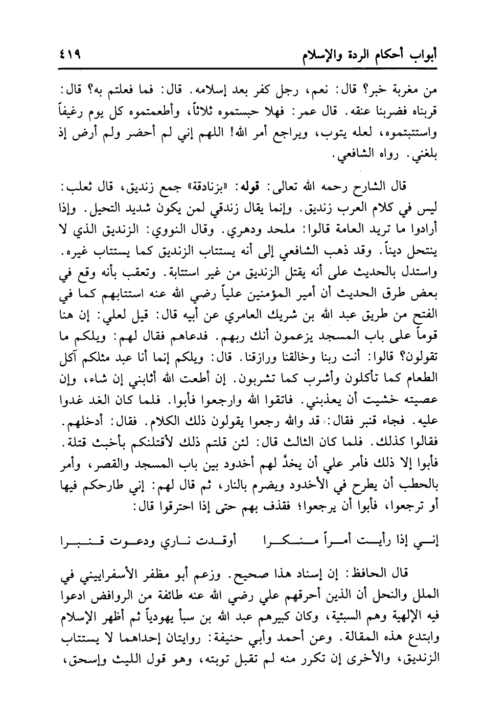 قَالَ الْحَافِظُ: إنَّ إسْنَادَ هَذَا صَحِيحٌ. وَزَعَمَ أَبُو مُظَفَّرٍ الأسْفَرايِينِيّ فِي الْمِلَلِ وَالنِّحَلِ أَنَّ الَّذِينَ أَحْرَقَهُمْ عَلِيٌّ - رضي الله عنه - طَائِفَةٌ مِنْ الرَّوَافِضِ ادَّعَوْا فِيهِ الْإِلَهِيَّةَ وَهُمْ السَّبَئِيَّةُ وَكَانَ كَبِيرُهُمْ عَبْدُ اللَّهِ بْنُ سَبَإٍ يَهُودِيًّا ثُمَّ أَظْهَرَ الْإِسْلَامَ وَابْتَدَعَ هَذِهِ الْمَقَالَةَ، وَعَنْ أَحْمَدَ وَأَبِي حَنِيفَةَ رِوَايَتَانِ إحْدَاهُمَا: لَا يُسْتَتَابُ، وَالْأُخْرَى: إنْ تَكَرَّرَ مِنْهُ لَمْ تُقْبَلْ تَوْبَتُهُ، وَهُوَ قَوْلُ اللَّيْثِ وَإِسْحَاقَ. وَحُكِيَ عَنْ أَبِي إِسْحَاقَ