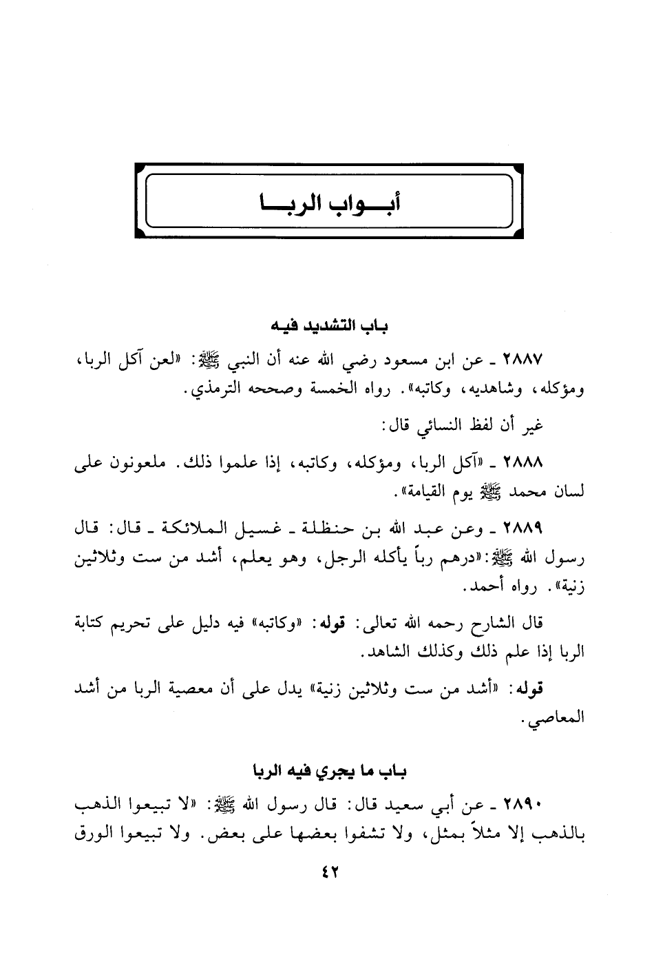 2887- عَنْ ابْنِ مَسْعُودٍ - رضي الله عنه - أَنَّ النَّبِيَّ - صلى الله عليه وسلم - لَعَنَ آكِلَ الرِّبَا وَمُؤْكِلَهُ وَشَاهِدَيْهِ وَكَاتِبَهُ. رَوَاهُ الْخَمْسَةُ وَصَحَّحَهُ التِّرْمِذِيُّ.